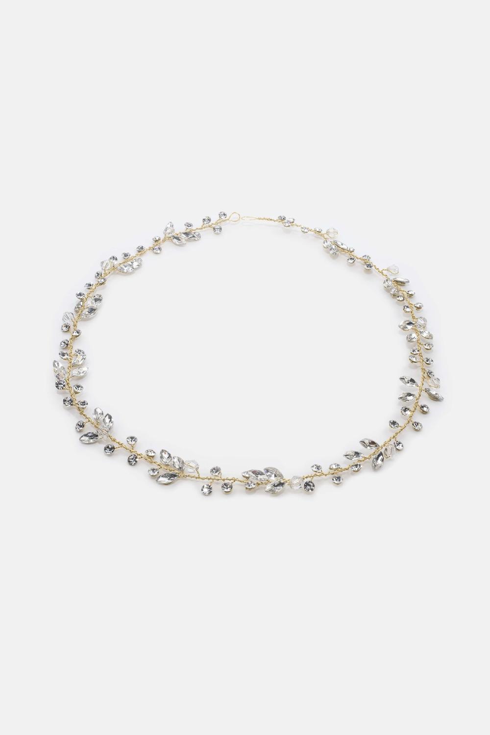 Besondere Anlässe, wie Ihre bevorstehende Hochzeit, verlangen nach auffälligen Schmuckstücken. Das von der Tiara inspirierte Gabi-Stirnband ist mit verschieden geformten Kristallen verziert, die in eine verzweigte Fassung eingebettet sind, und wird Sie beim Gang zum Altar garantiert in seinen Bann ziehen.