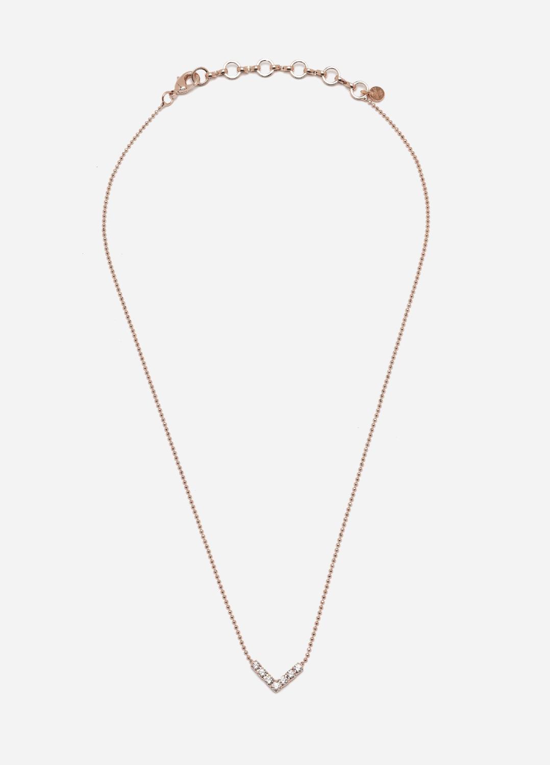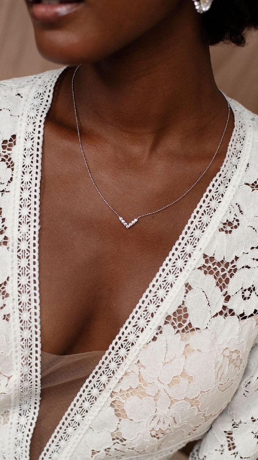 Die Lacy-Halskette ist ein raffiniertes Schmuckstück, das aus einer Perlenkette und einer V-förmigen Fassung mit Swarovski-Kristallen besteht. Sie ist mit einer Beschichtung in Rhodium, 14-karätigem Gold oder Roségold erhältlich.