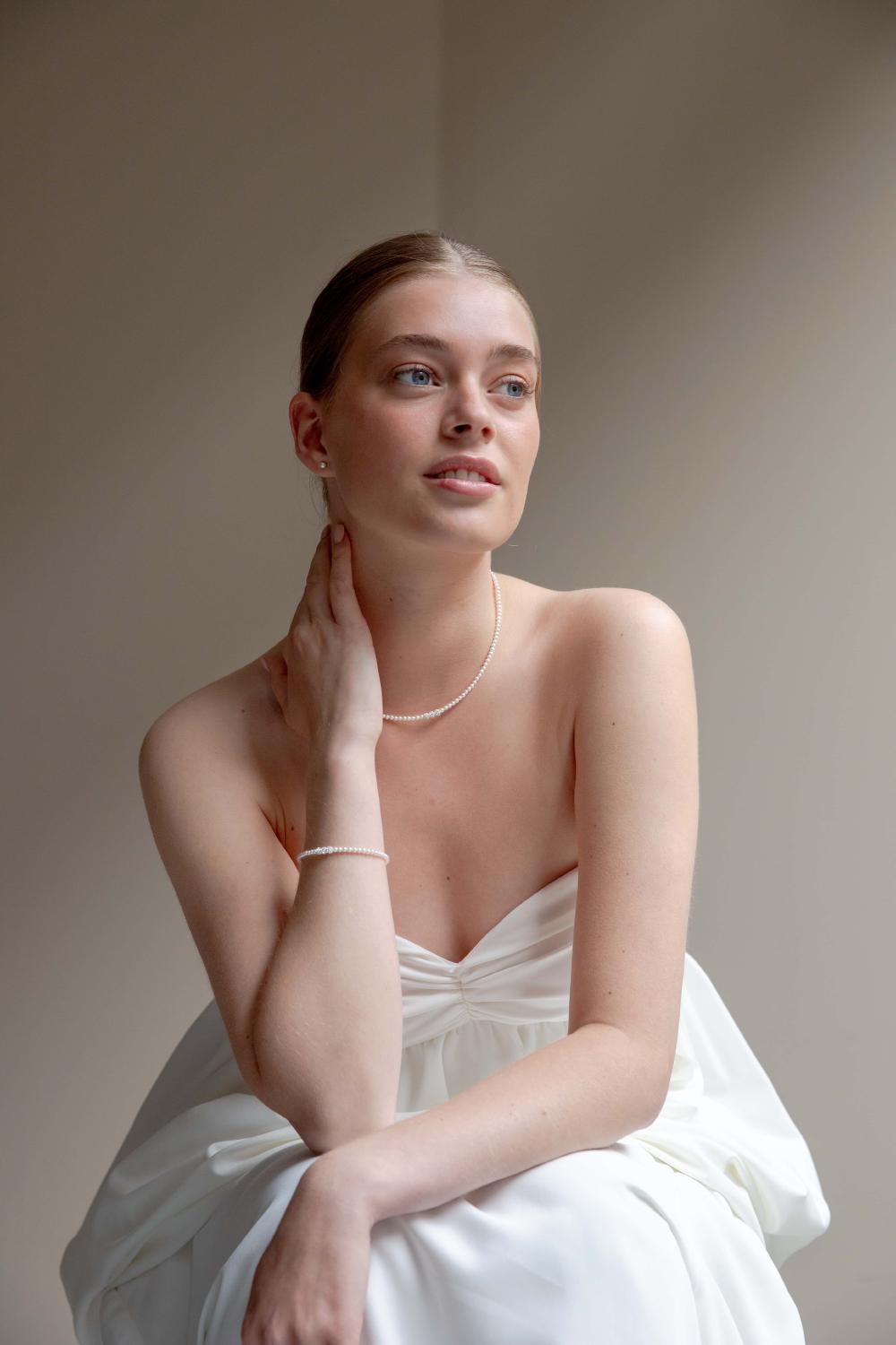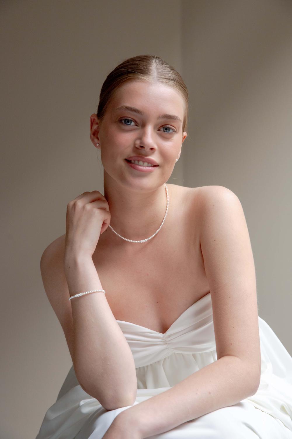 Die Perlenkette Marlot ist ein echter Abrazi-Klassiker. Die Halskette besteht aus hochwertige Swarovski-Perlen mit einem einzigartigen Kristallkern, mit Kristallen verzierten Mittelperlen und einem Verschluss aus 925er Sterlingsilber mit Rhodium-Beschichtung. Wenn Sie auf der Suche nach einem klassischen Halsketten-Set für die Braut sind, sollten Sie sich auch das Marlot-Armband ansehen.