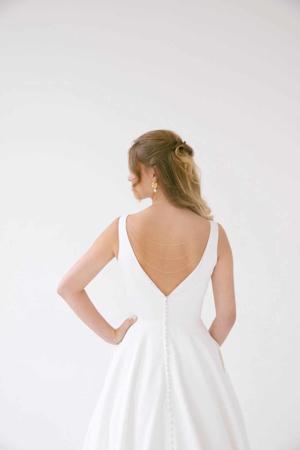 Ein einzigartiges Stück, das dazu geschaffen wurde, den Rücken Ihres Brautlooks zu veredeln. Die Sands Rückenkette ist perfekt für Bräute, die die Eleganz einer Kette möchten, ohne die Aufmerksamkeit von der Vorderseite ihres Kleides abzulenken. Sie wurde so entworfen, dass sie sich entlang Ihres Rückens drapiert und mit zwei Verschlüssen auf beiden Seiten befestigt wird, die an kleinen Schlaufen an den inneren Schulterträgern Ihres Kleides angebracht sind. Ein kleiner Hinweis: Dies erfordert eine kleine Anpassung an Ihrem Kleid, aber jede Hochzeitsstylistin (oder eine geschickte Oma) kann das problemlos erledigen. Es ist ein wunderschönes kleines Detail für Ihren großen Tag.