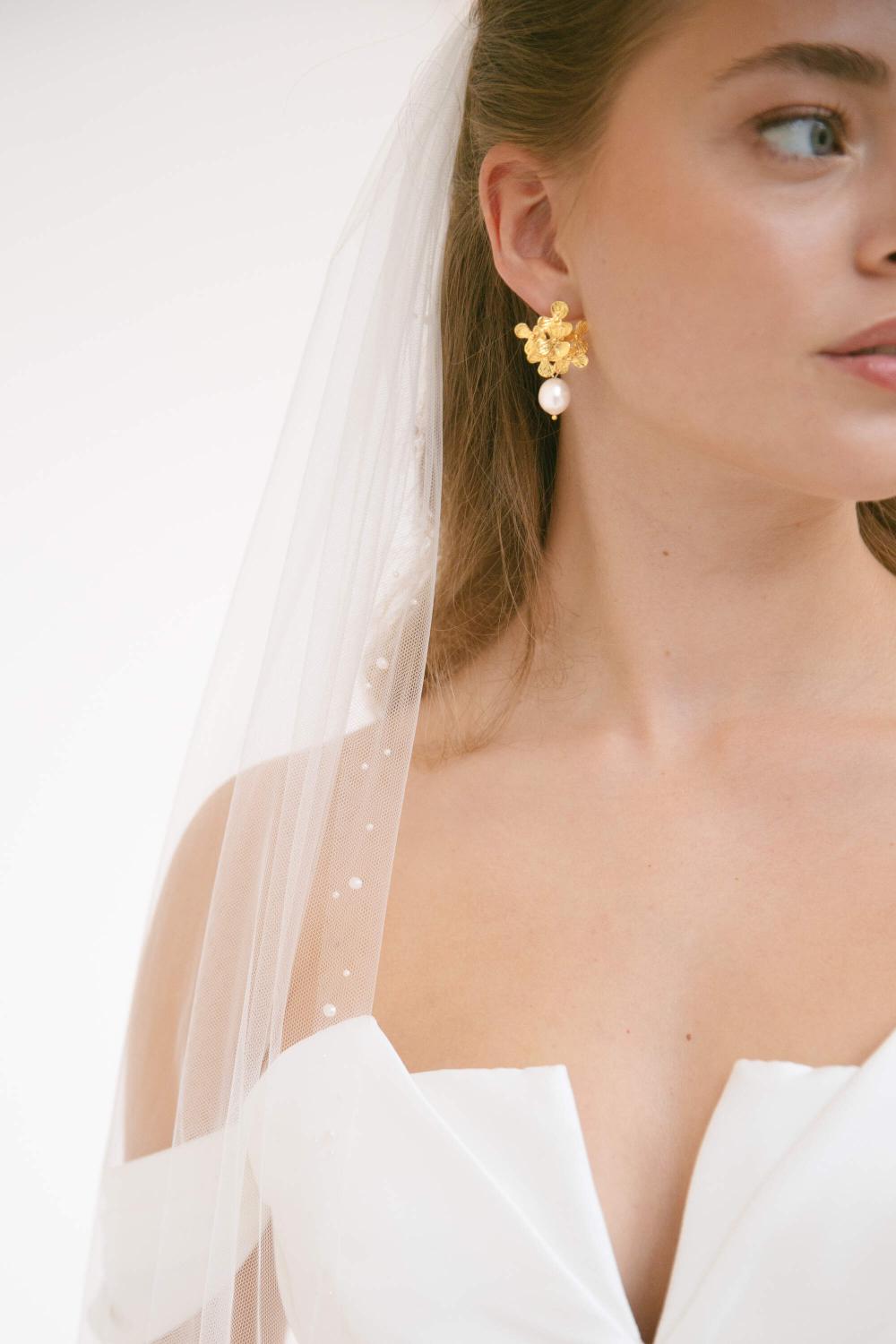 Die Amaya Perlenohrringe verfügen über ein Cluster zarter goldener Blumen, die eine einzelne Süßwasserperle umschließen. Diese Kombination schafft ein auffallend feminines Stück, perfekt für diejenigen, die eine elegante, aber dennoch kraftvolle Aussage machen möchten. Erhältlich mit 14k Gold- oder Rhodium-Beschichtung.