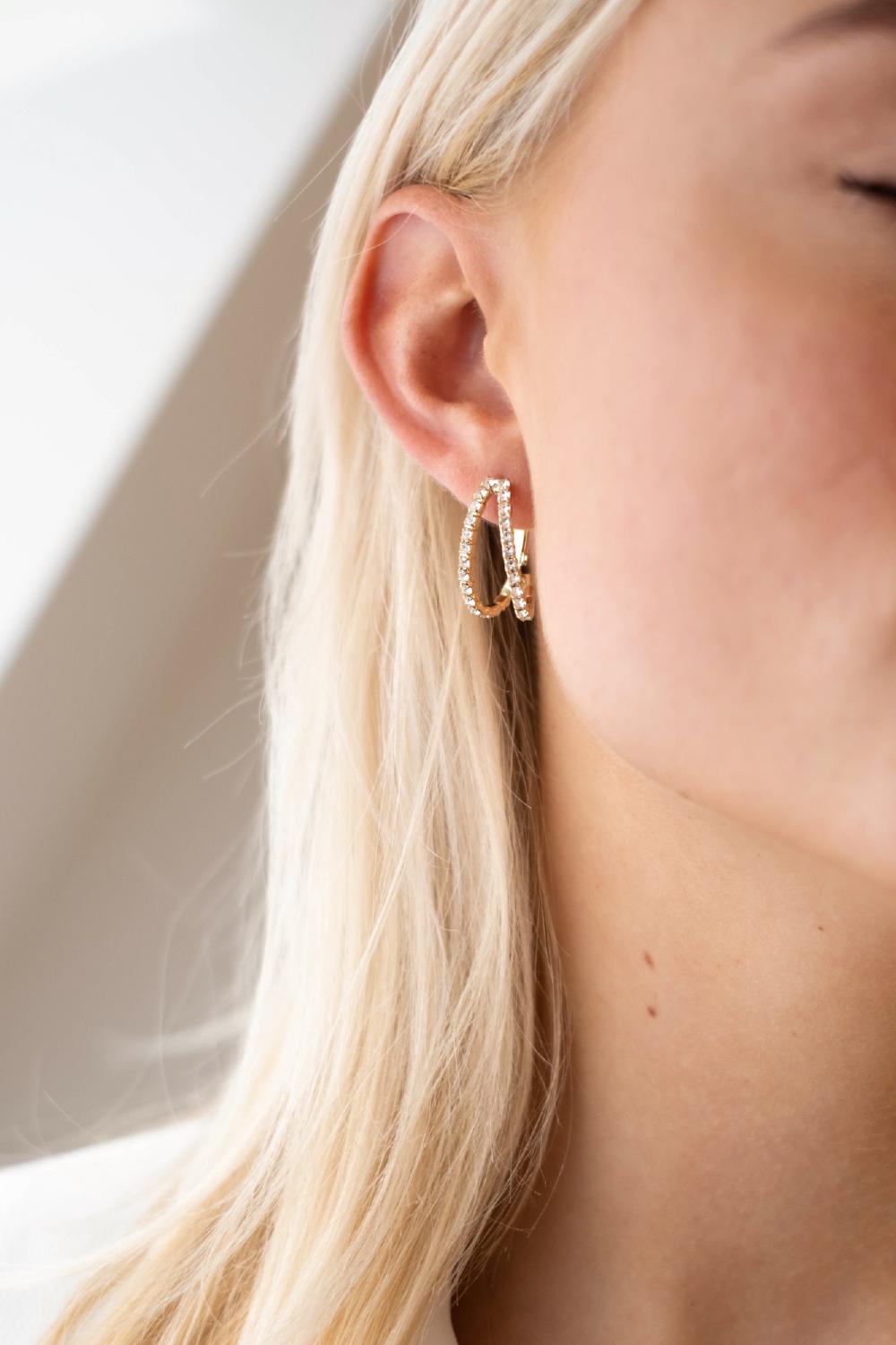Die Marilyn Earrings sind wunderschöne Statement-Ohrringe für Bräute. Diese zeitlosen Stücke bestehen aus zwei aneinander befestigten Creolen, die mit kleinen Swarovski-Kristallen besetzt sind. Die Marilyn-Ohrringe sind mit einer Rhodium-, 14-karätigen Gold- oder Roségold-Beschichtung in zwei verschiedenen Größen erhältlich.