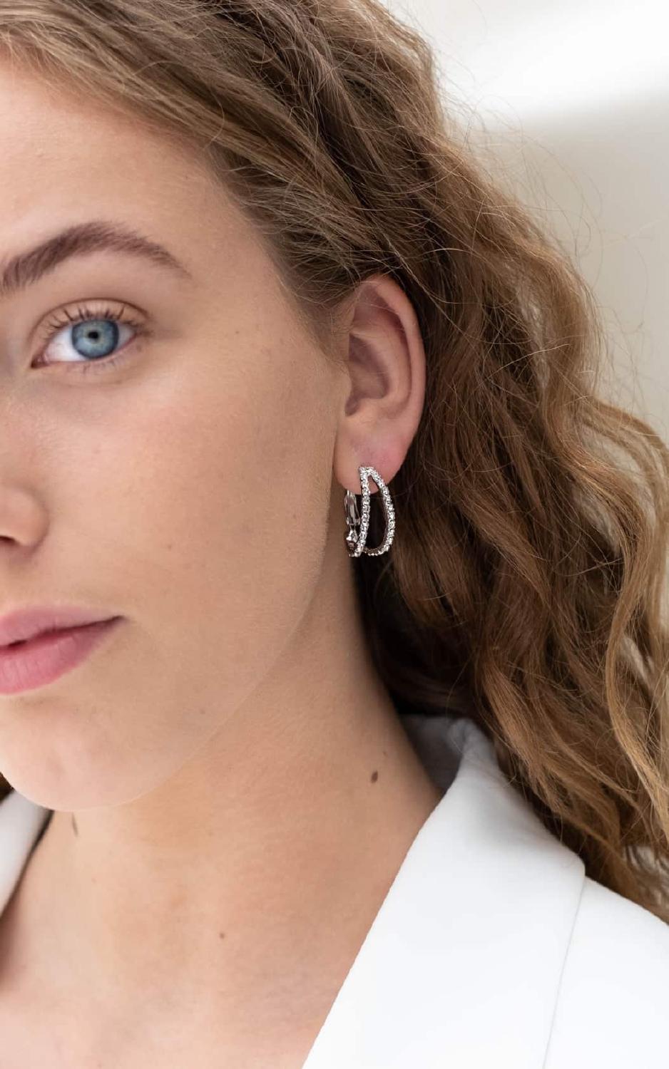 Die Marilyn Earrings sind wunderschöne Statement-Ohrringe für Bräute. Diese zeitlosen Stücke bestehen aus zwei aneinander befestigten Creolen, die mit kleinen Swarovski-Kristallen besetzt sind. Die Marilyn-Ohrringe sind mit einer Rhodium-, 14-karätigen Gold- oder Roségold-Beschichtung in zwei verschiedenen Größen erhältlich.