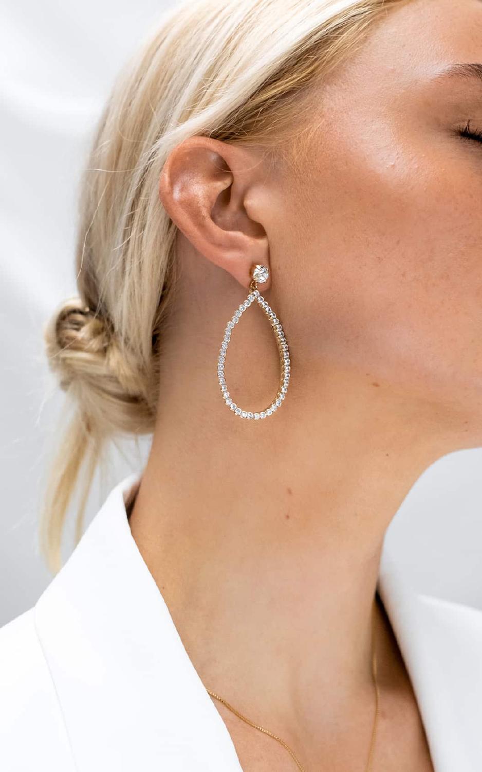 Die Nina-Ohrringe sind die minimalistischere Version der Grace-Ohrringe. Diese eleganten Brautohrringe haben einen tropfenförmigen Reif aus Messing, der mit kleinen Kristallen besetzt ist. Die Nina-Ohrringe sind perfekt für die moderne Braut und mit einer Rhodium-, 14kt Gold- oder Roségold-Beschichtung erhältlich.