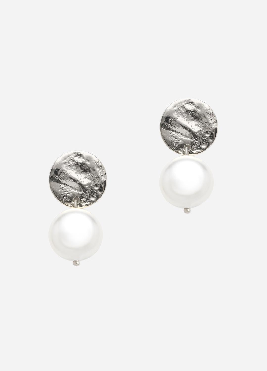 Die Olga-Ohrringe bestehen aus einem runden, gehämmerten Ohrstecker mit einem flachen Perlenanhänger. Diese Ohrringe, die perfekt für die moderne Braut sind, sind mit einer Rhodium-, 14-karätigen Gold- oder Roségoldbeschichtung erhältlich.