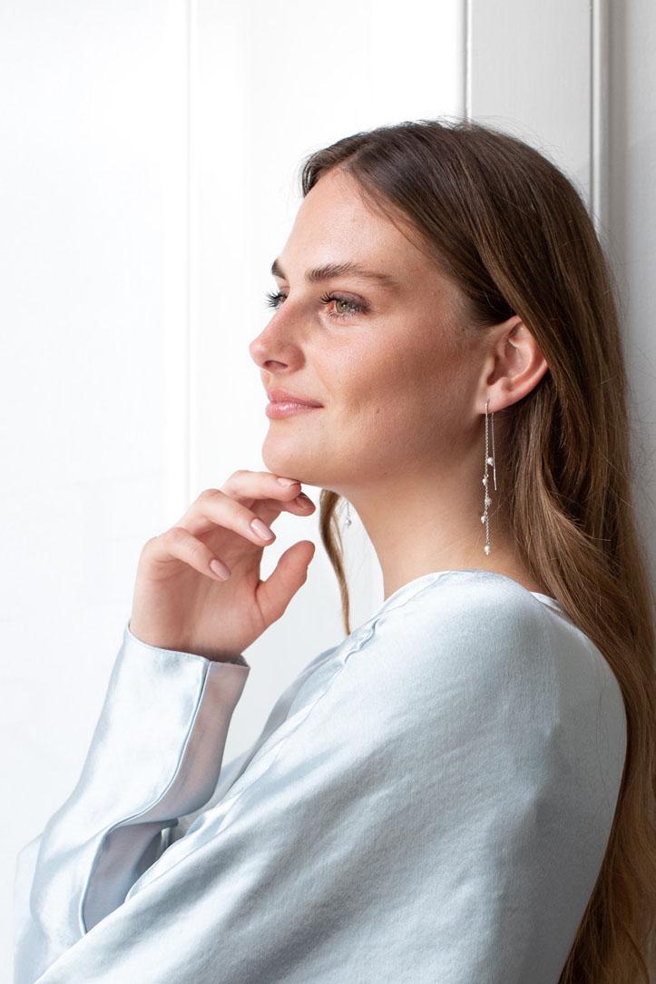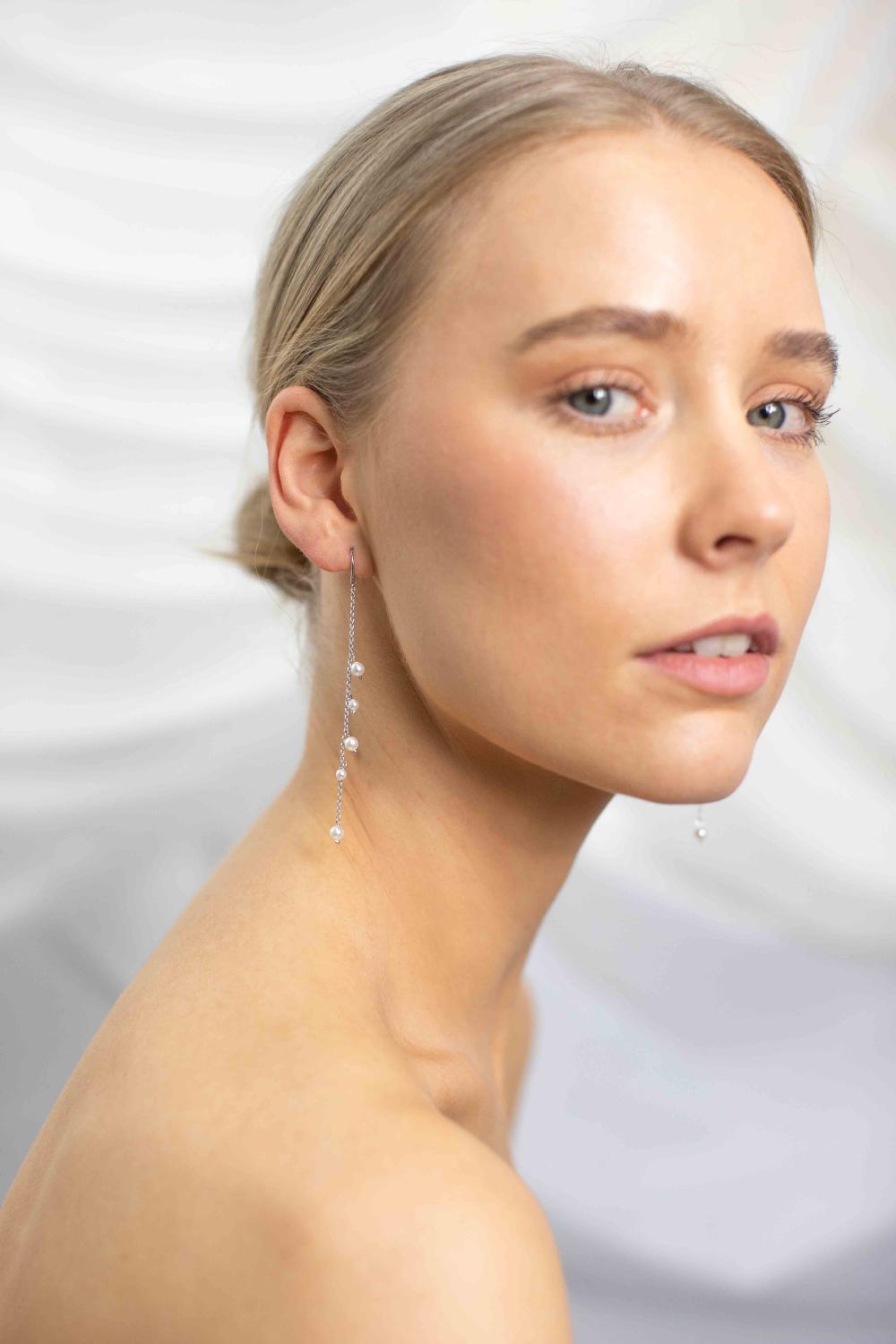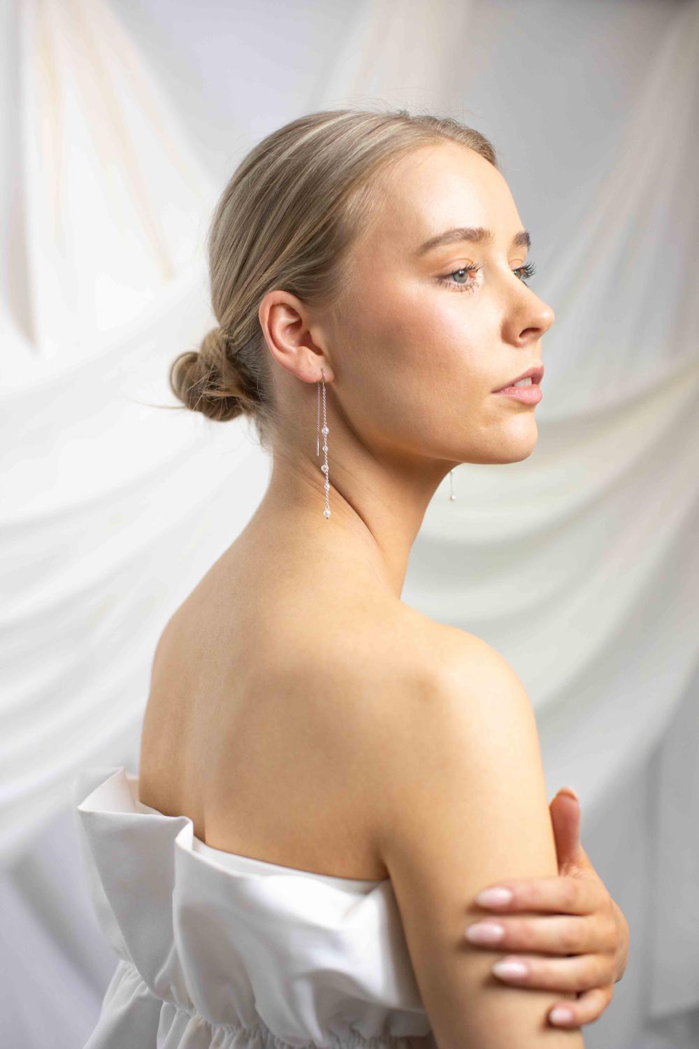 Die eleganten Rosaline Fädler enthalten eine Reihe winziger Perlen und sind perfekt für die moderne Braut. Sie sind etwas verspielter als die Maren-Ohrringe und daher eine gute Wahl, wenn Sie einen weniger klassischen Look suchen. Dank des Hakens in der Mitte des Einfädlers bleiben sie sicher an ihrem Platz. Die Rosaline-Ohrringe sind in 14-karätiger Gold- und Rhodiumbeschichtung erhältlich.