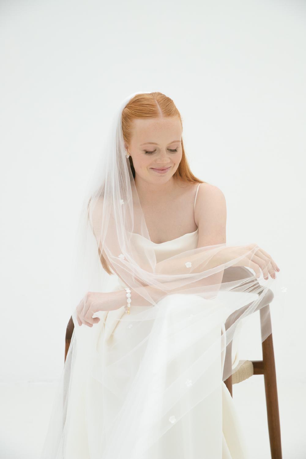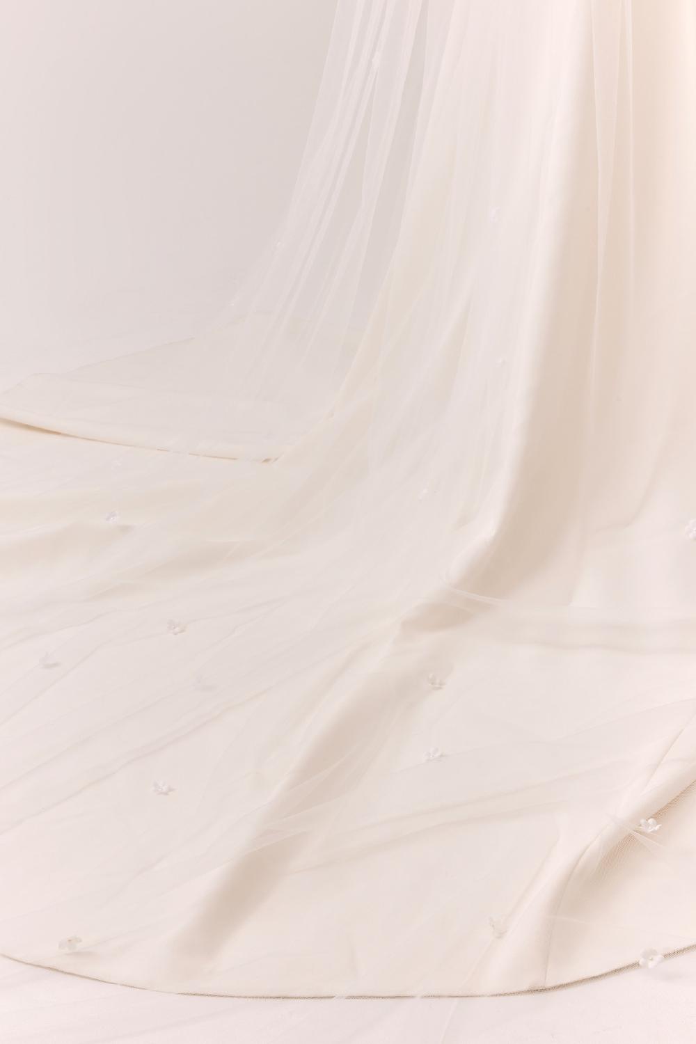 Der Amber Schleier ist ein bezaubernder Schleier aus elfenbeinfarbigem italienischem Tüll. Kleine weiße Blüten, jede mit einer Perle in der Mitte, sind sorgfältig befestigt und über den gesamten Schleier verteilt.
