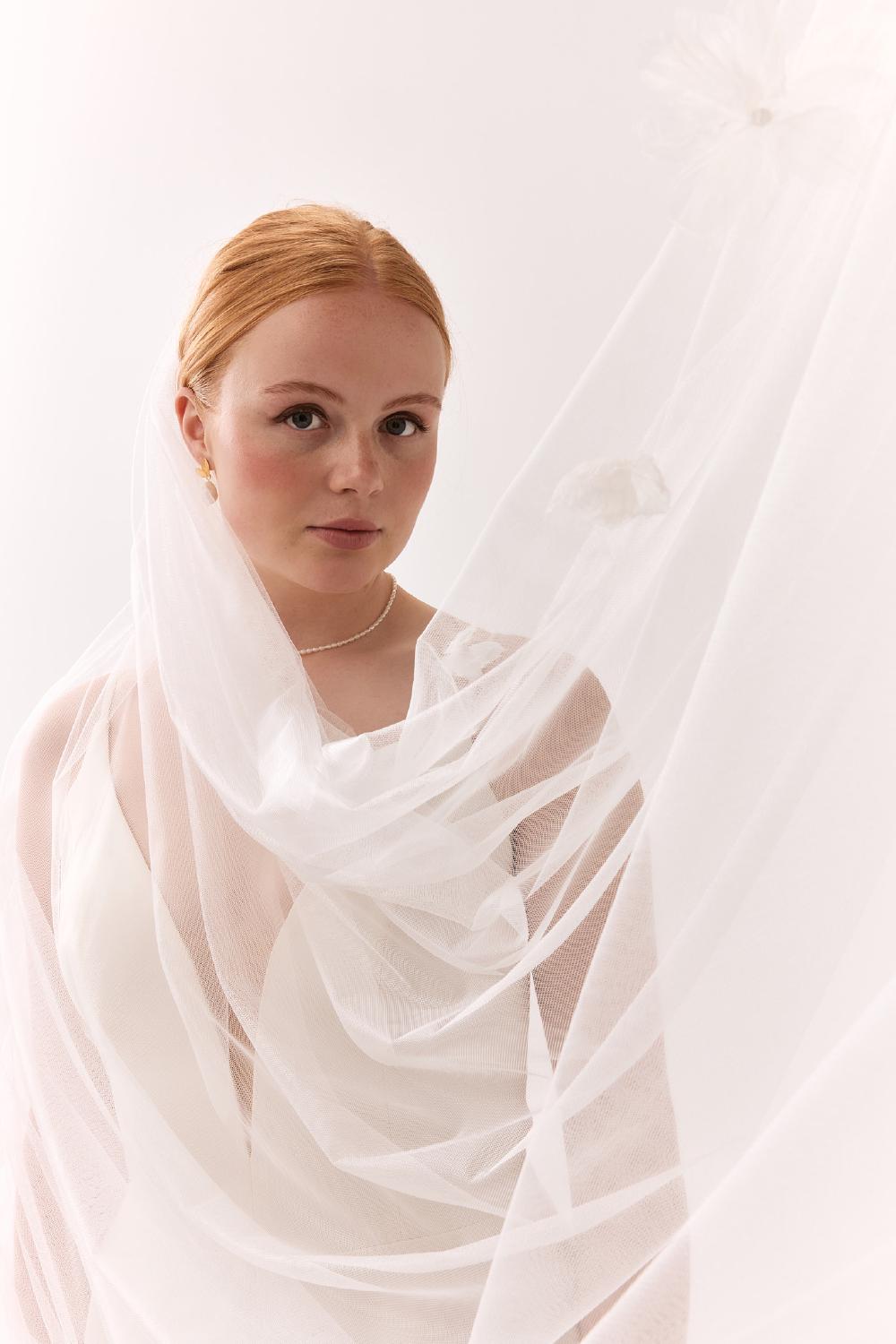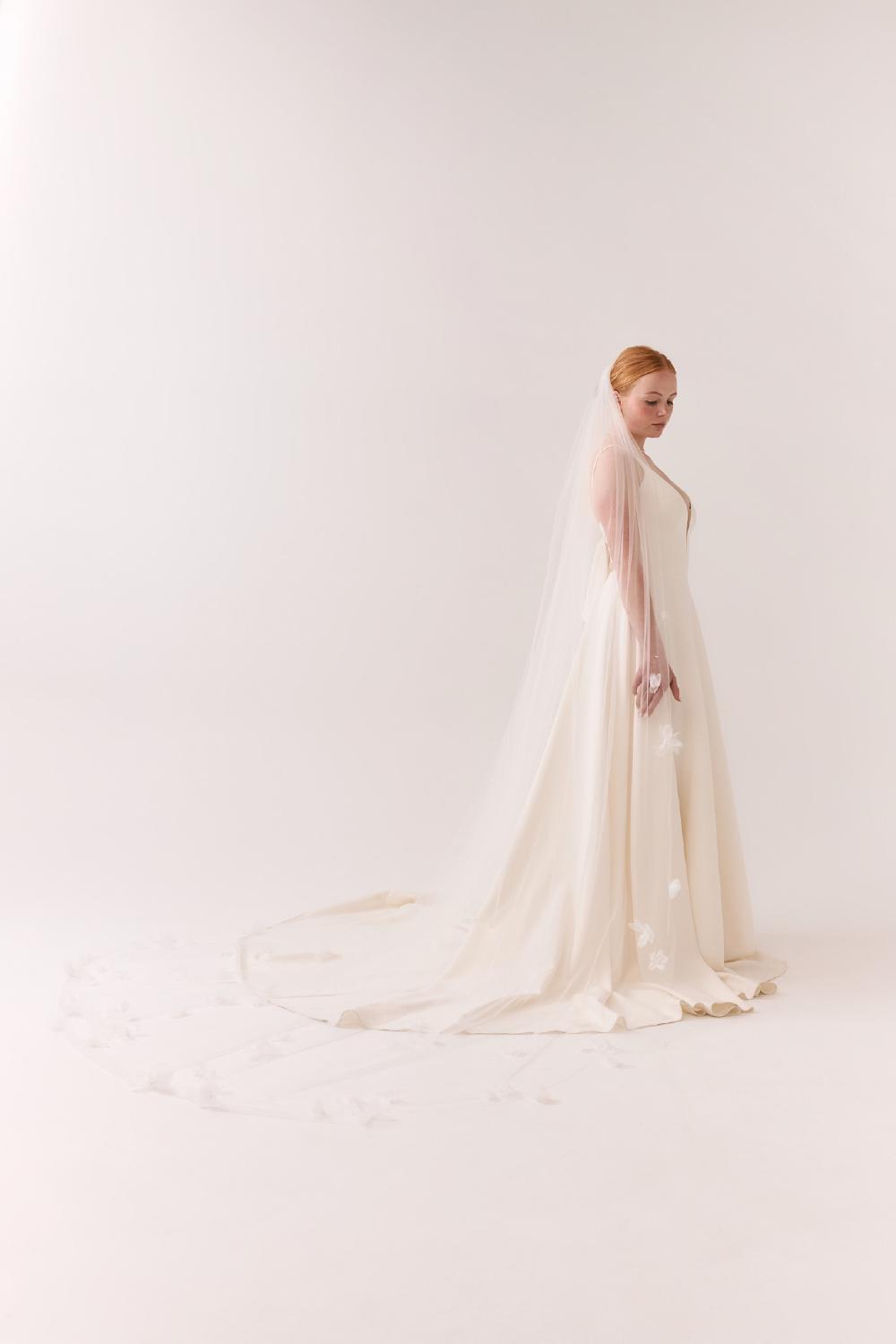 Der Rian Schleier ist ein zauberhafter Schleier aus ivoryfarbenem italienischen Tüll. Wunderschöne Organza-Blumen sind sorgfältig auf dem Schleier platziert und verleihen ihm eine raffinierte und romantische Ausstrahlung.