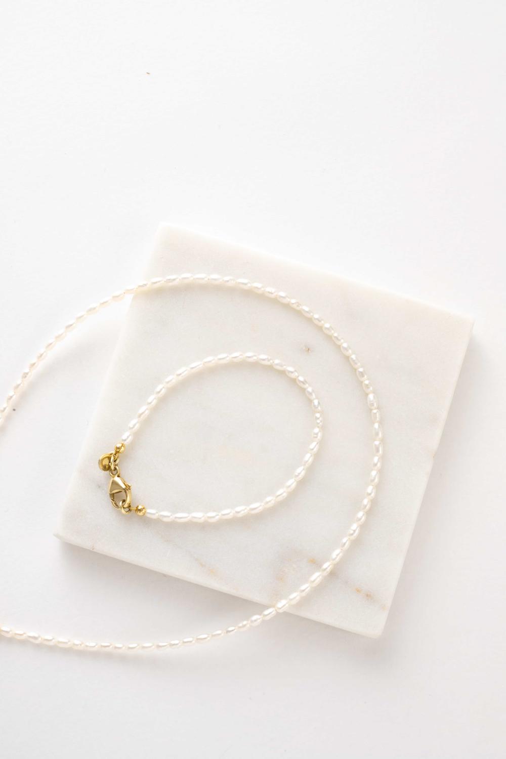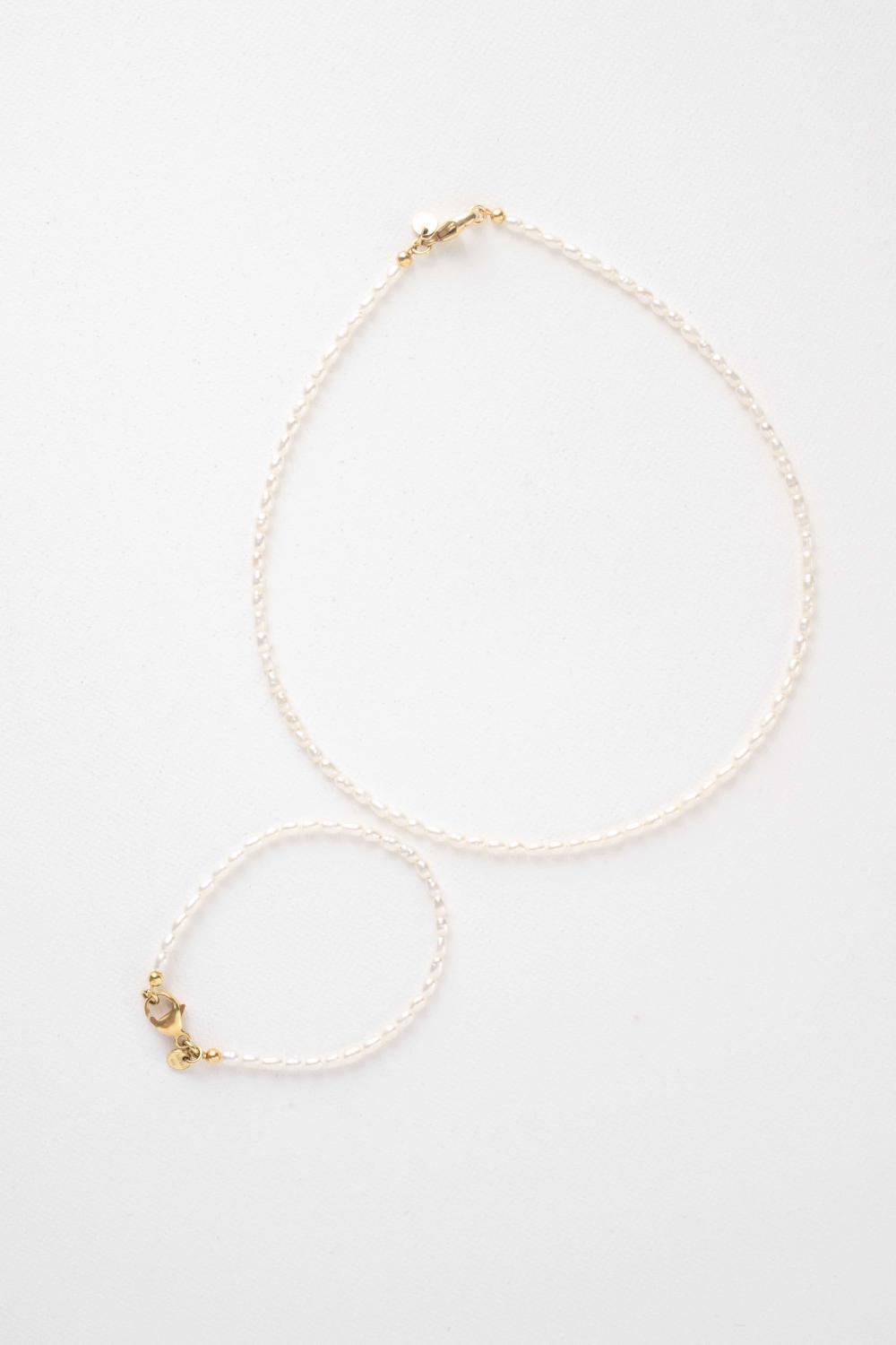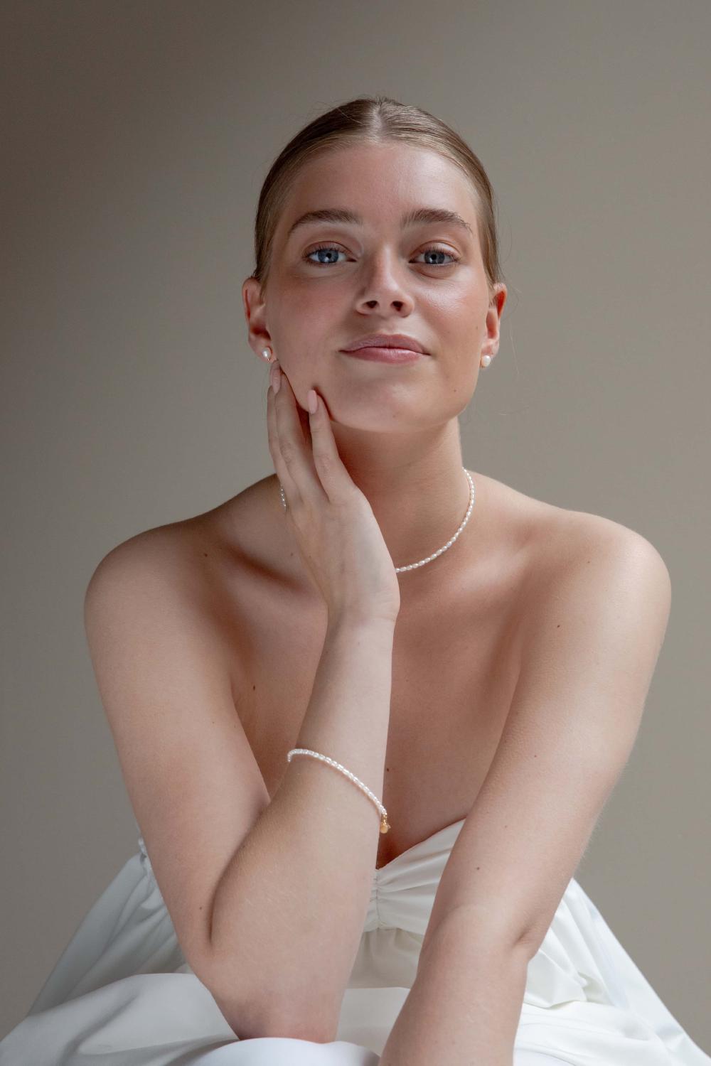 Das Schmuckset Always besteht aus einem Perlenkette und einem feingearbeiteten Armband mit wunderschönen kleinen Reisperlen. Die kleinen Perlen machen das Brautschmuckset sehr tragbar und leicht mit anderen Halsketten zu kombinieren.