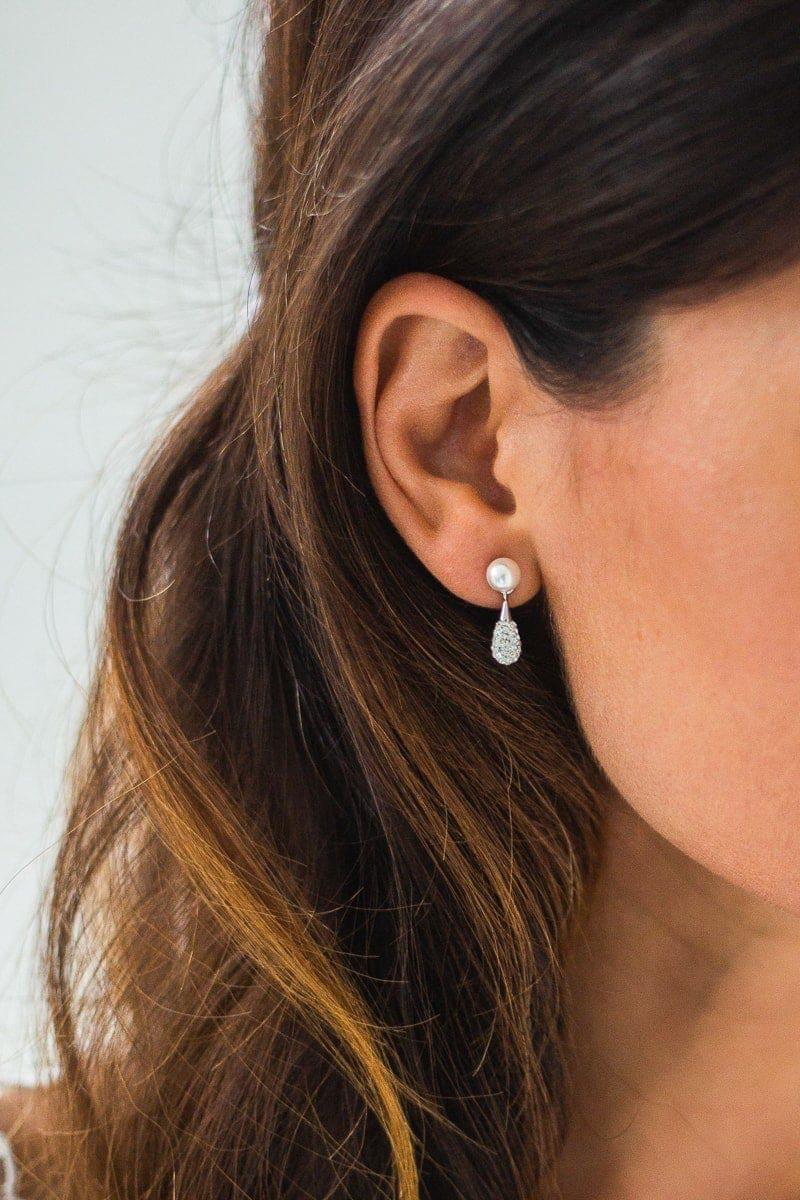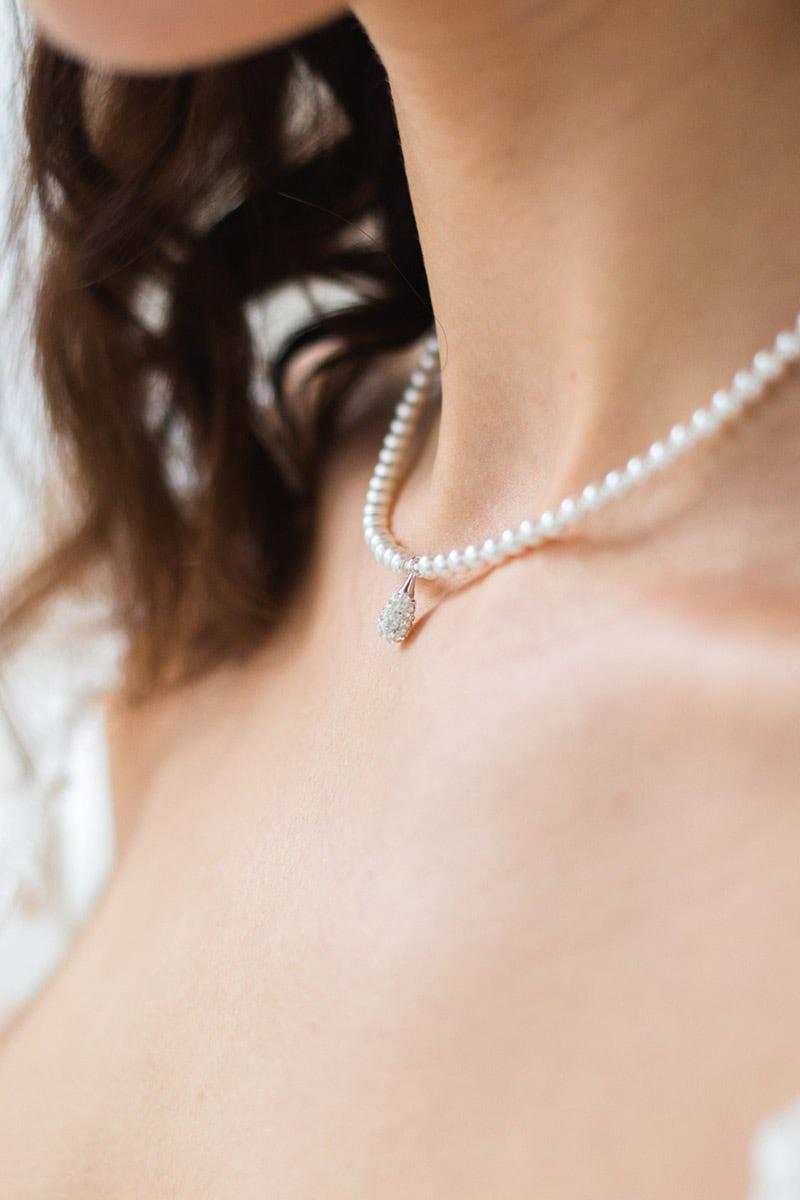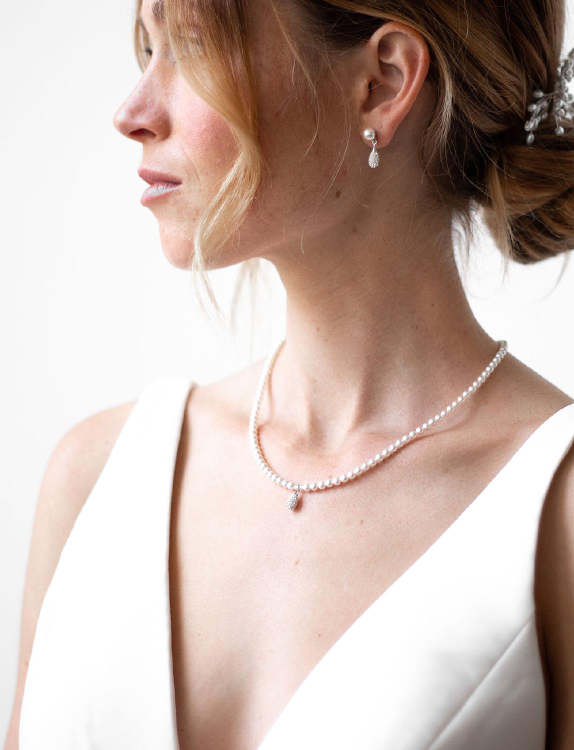 Die Halskette Ariana mit Kristallperlen und kristallverziertem Anhänger ist wie gemacht für die klassische Braut. Sowohl Anhänger als auch Verschluss sind aus rhodiniertem 925er Sterlingsilber gefertigt für einen dauerhaften Glanz. Die Ohrringe aus der Ariana Serie haben denselben Anhänger und passen perfekt zur Kette.