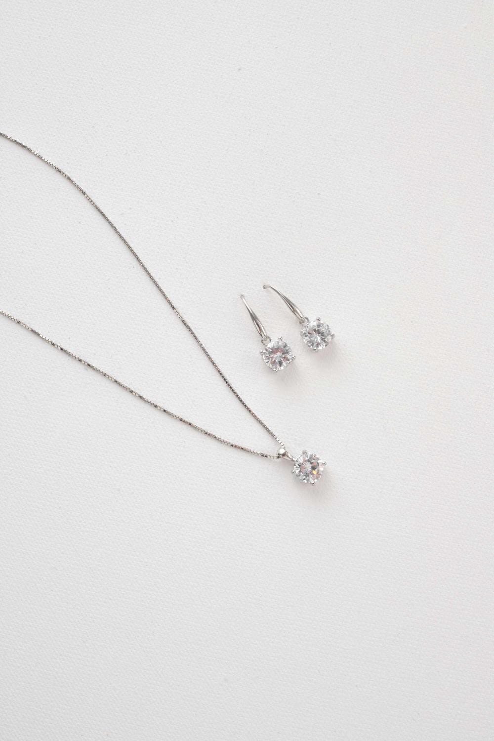 Das Schmuckset Ava besticht durch sein puristisches und zeitloses Design. Die schlichte Venezianerkette in 925er Silber mit einem einzelnen Kristall als Anhänger ist mit einer Rhodium-, 14 Karat Gold oder Roségoldbeschichtung erhältlich. Die passenden Ohrringe mit Kristallanhänger machen Ava zu einem wunderschönen Schmuckset für die klassische Braut.