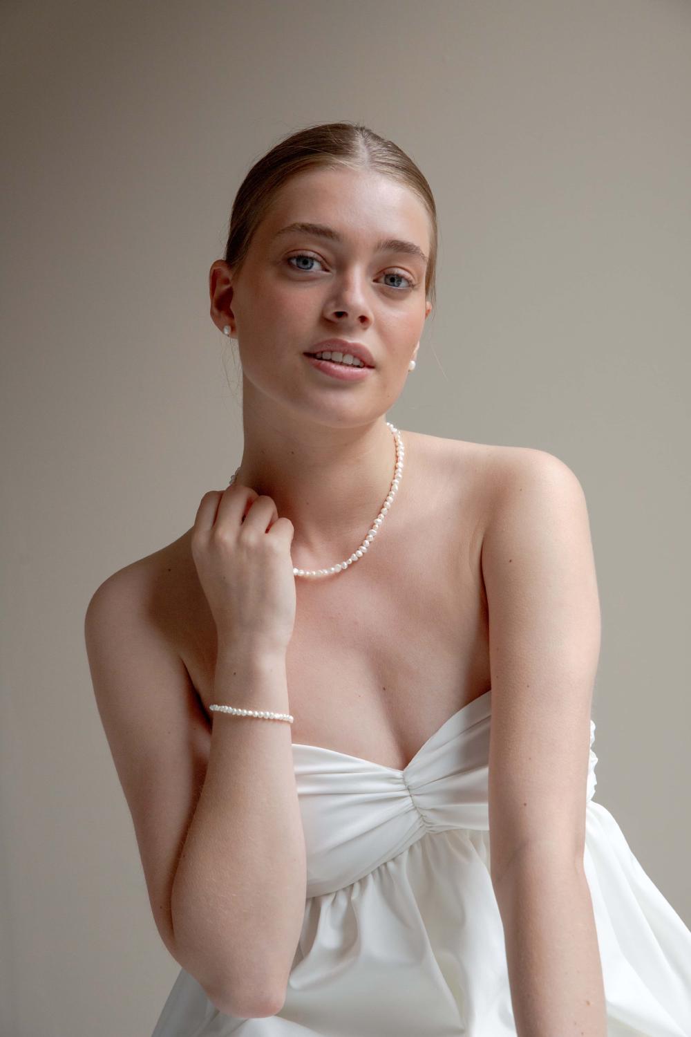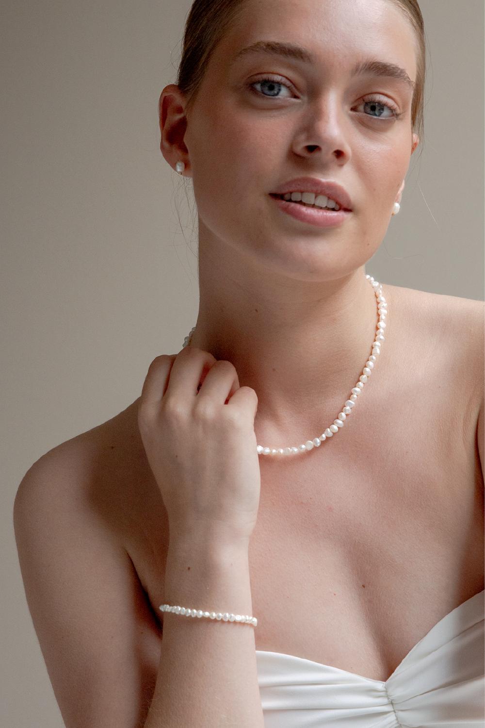 Das Schmuckset Epoch besteht aus einem Perlenhalsband und -armband und ist aus wunderschönen winzigen Barockperlen gearbeitet. Durch die unregelmäßige Form der Perlen kreiiert das Schmuckset den perfekten "unperfekten" Look. Ein prächtiges Set für die moderne Braut.