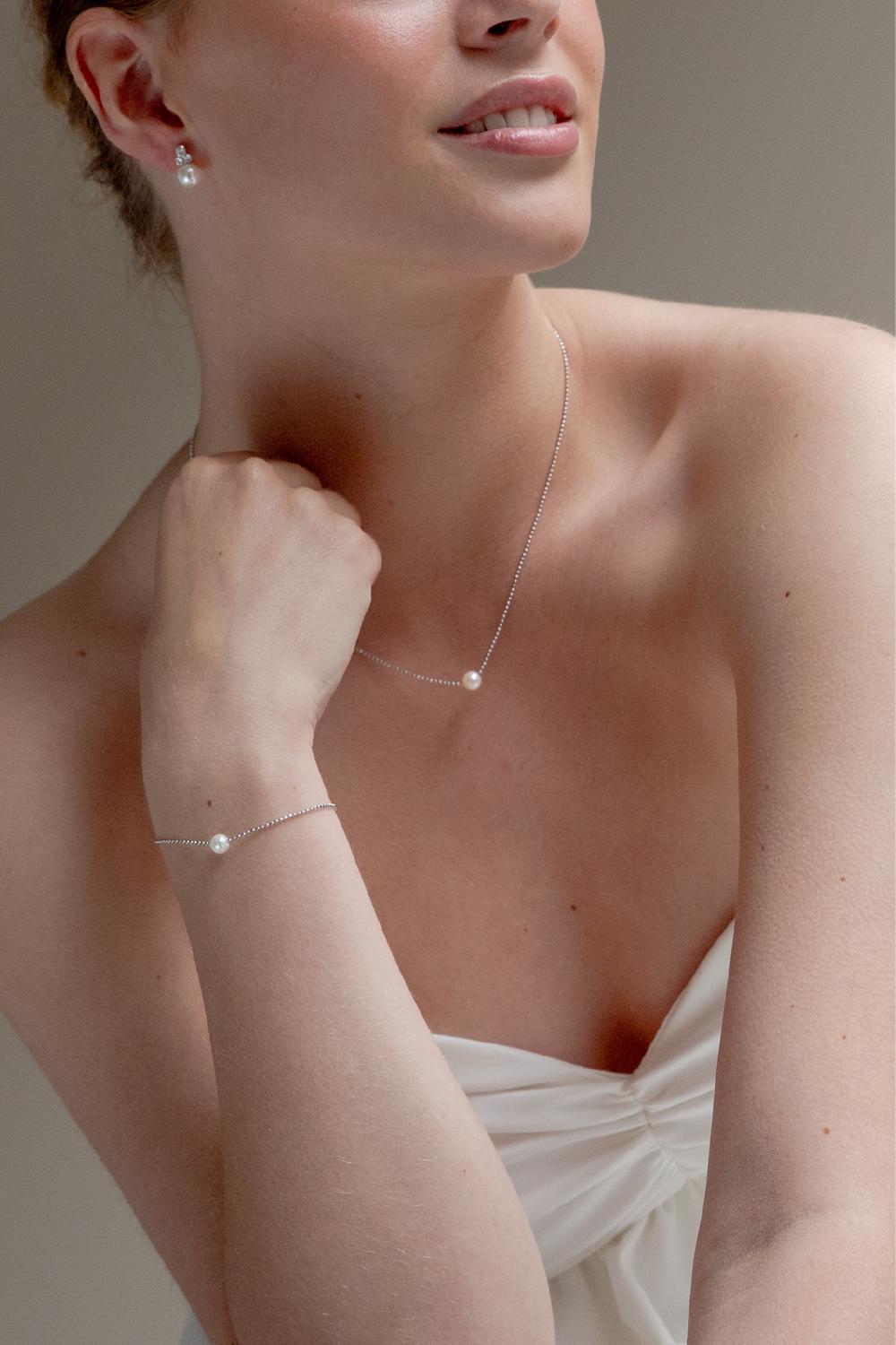 Das Schmuckset Jess ist besonders fein gearbeitet und die perfekte Wahl für die klassische Braut. Das Set besteht aus einer Kette in 925er Sterlingsilber mit einer einzelnen Perle und einem passenden Armband. Es ist wahlweise mit einer Rhodium-, 14k Gold- oder Roségoldbeschichtung erhältlich. Ein wunderschönes Brautschmuckset, an dem Sie noch lange nach der Hochzeit Freude haben.
