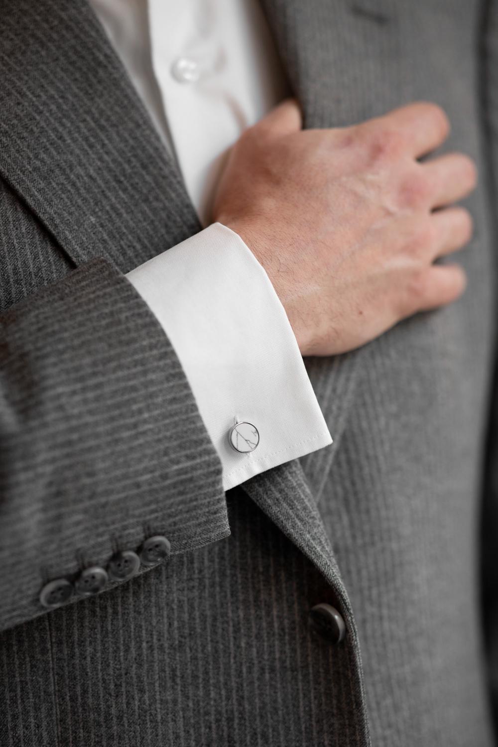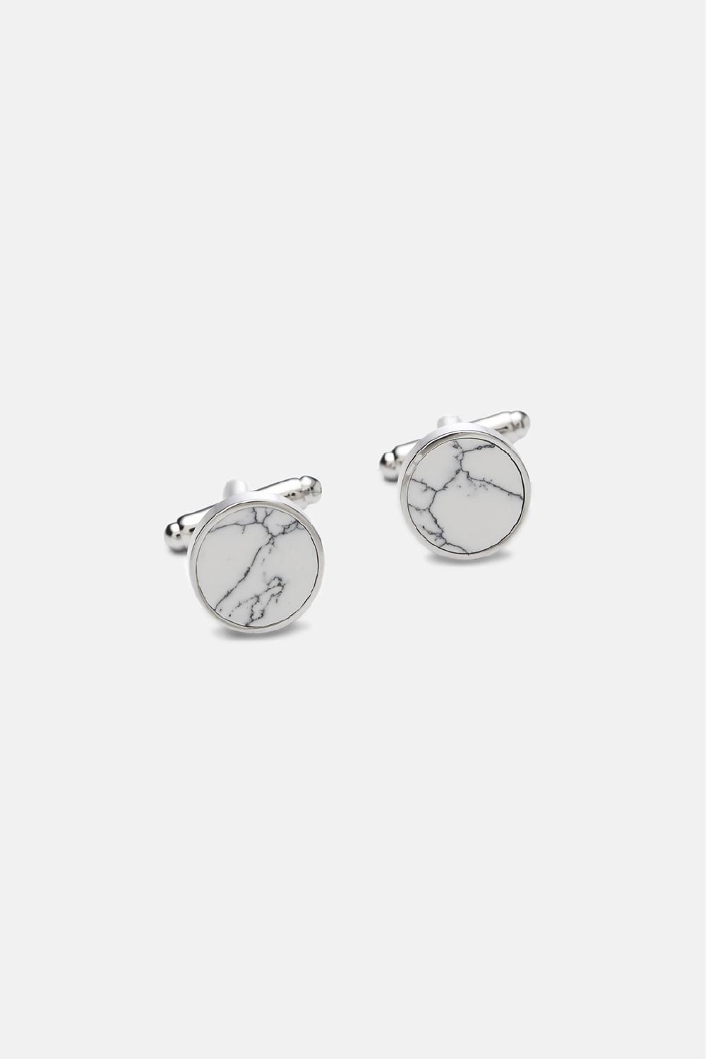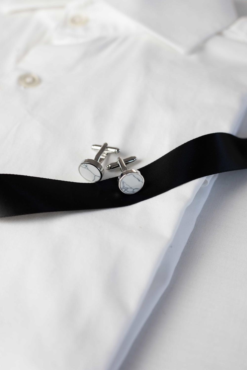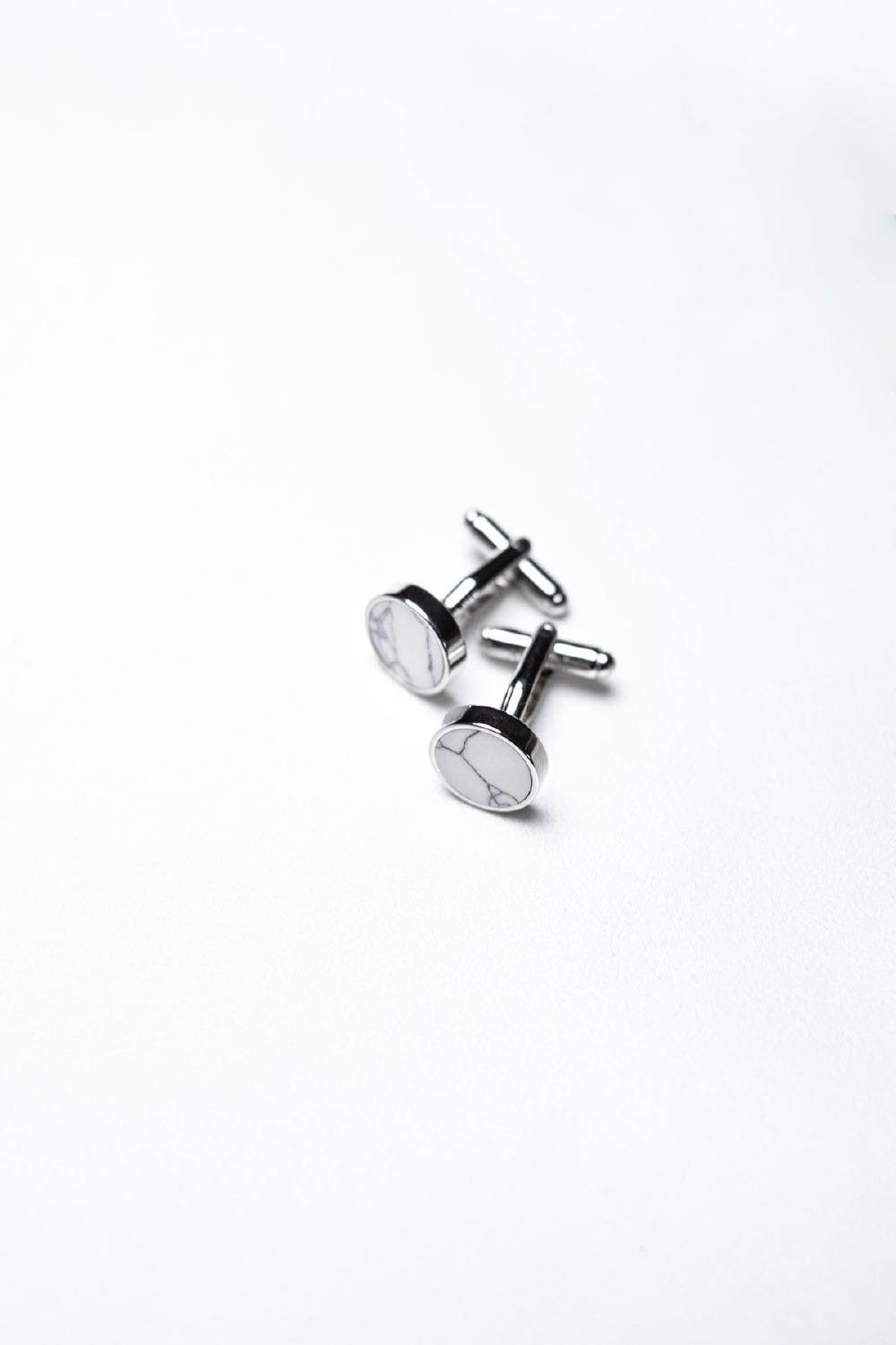 The white Marble Cufflinks are a fashionable and modern addition to any gent's, groom's or groomsmen's attire. These silver-colored cufflinks are crafted for Abrazi's Mens collection from rhodium plated brass and precision-cut marble.