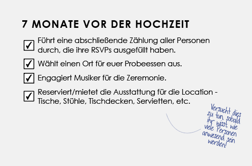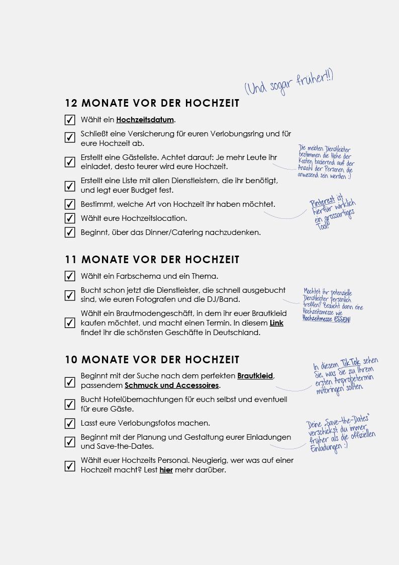 Natürlich sind die Zeitangaben in dieser Checkliste nur Empfehlungen; ihr entscheidet letztendlich, ob und wann ihr bestimmte Entscheidungen trefft. Es ist eure Hochzeit!