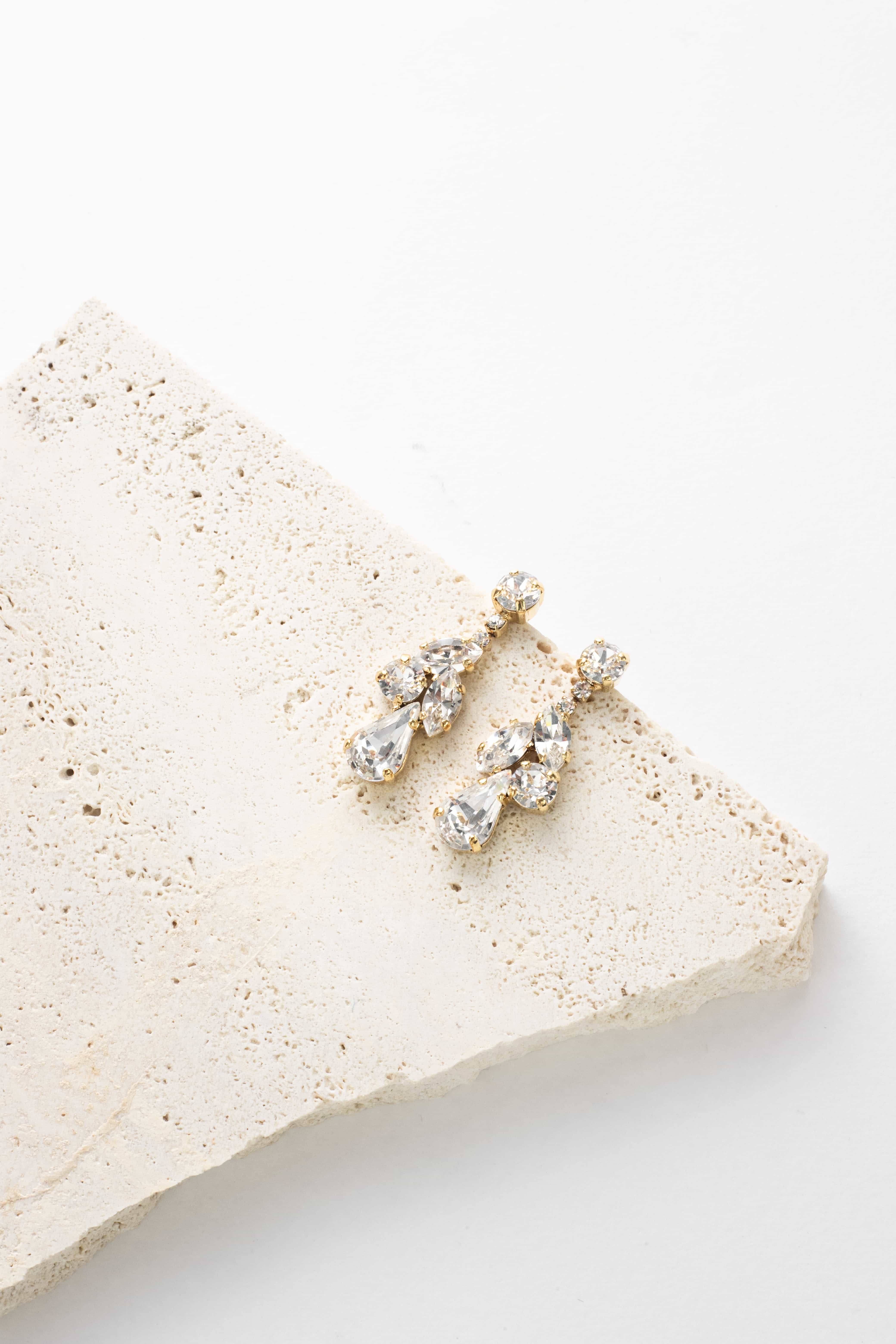 The Zola Earrings are an excellent choice for the bride who prefers a more colorful look. These are true statement pieces. Adorned with colored crystals, they’ll make her sparkle on her special day.