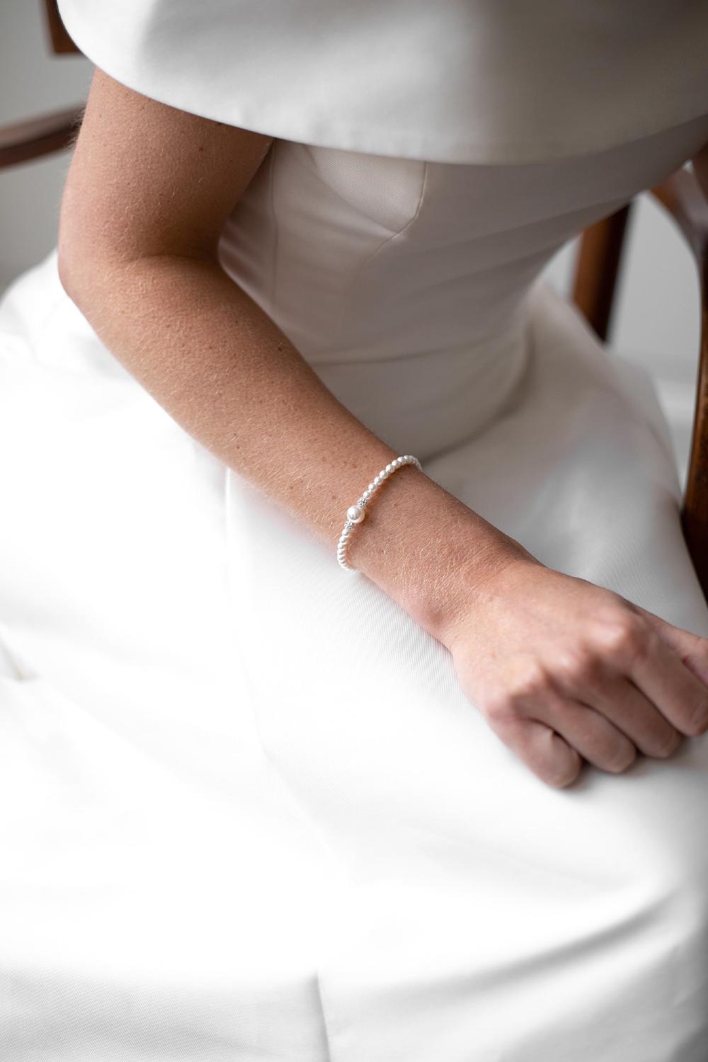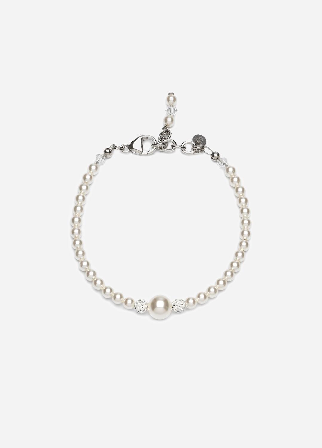 The Taylor Bracelet is an Abrazi favorite and has been part of the Bridal collection for years. The bracelet is made of Swarovski pearls with a unique crystal core and has two smaller beads embellished with tiny crystals and a slightly bigger pearl in the middle. The closure is made of 925 sterling silver plated with rhodium. The bracelet can be paired with the Taylor Necklace or can be worn on its own.