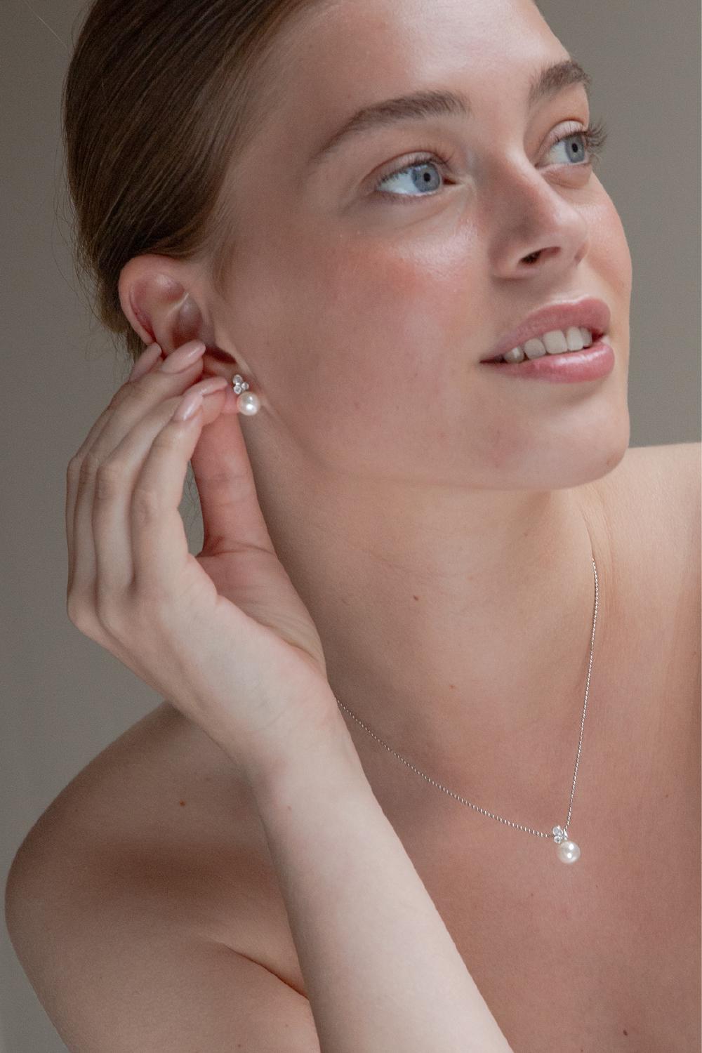 The Julia Earrings offer a blend of subtle elegance and classic style. Featuring Swarovski pearls and three delicate crystals set in a sturdy brass setting, these earrings are versatile enough to complement the Julia Pearl Necklace or any other jewelry you choose. Available in rhodium, 14kt gold, or rose gold plating, the Julia Earrings are a timeless choice for your special day.