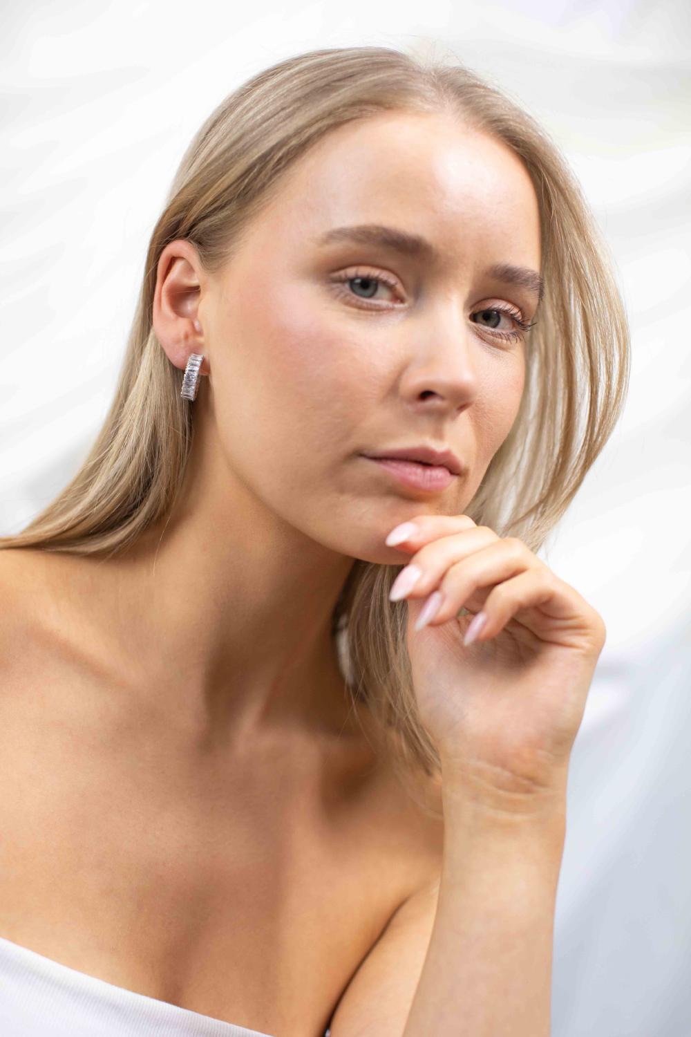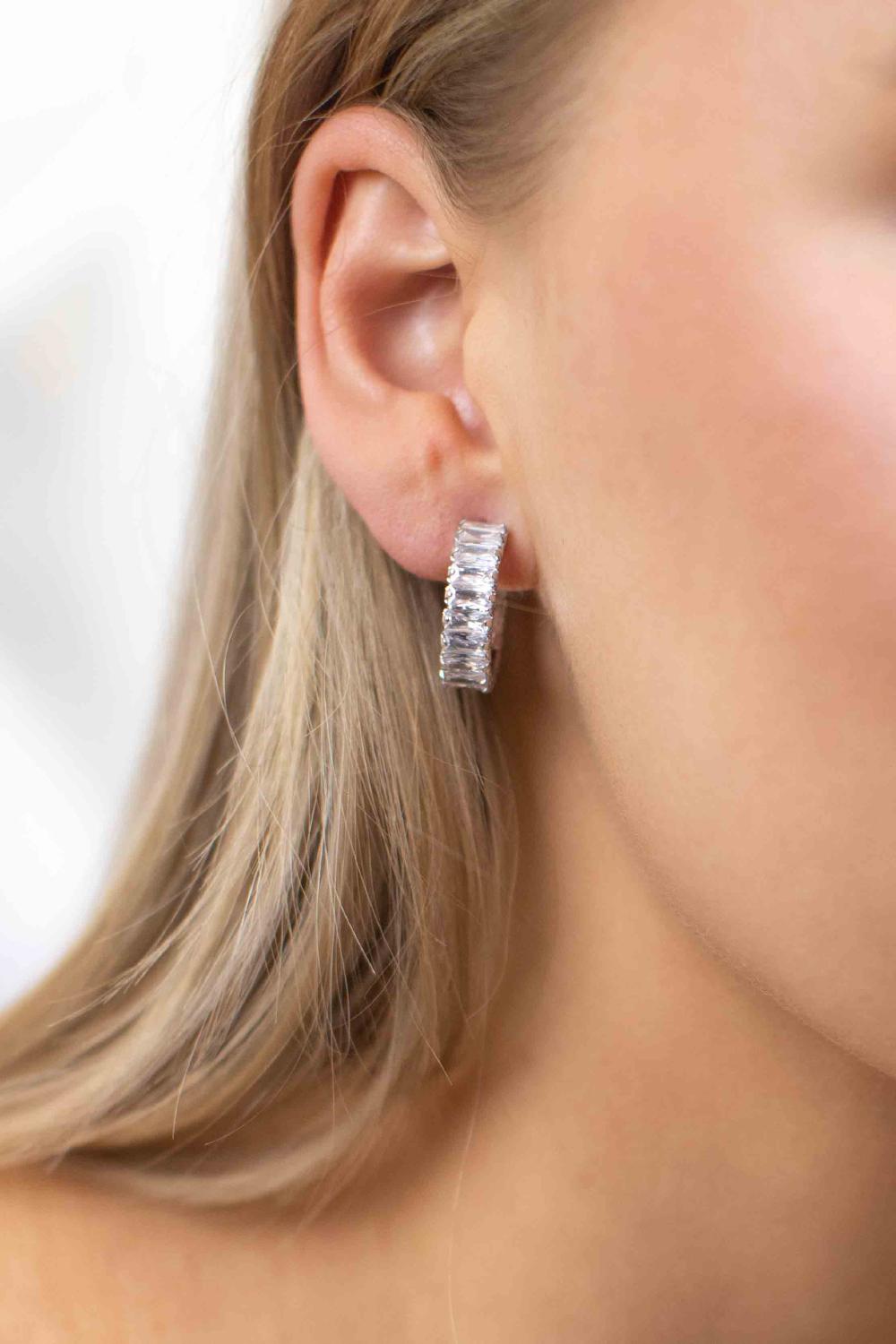 The Lauren earrings are a perfect combination of classic and modern design, an absolute must-have for any bride looking shiny hoops for her big day. These earrings are perfect to wear on their own or in combination with the Baguette necklace and/or bracelet for a complete look. The earrings are made with small baguette shaped crystals that are carefully placed around the brass earring, and are available with gold or rhodium plating.