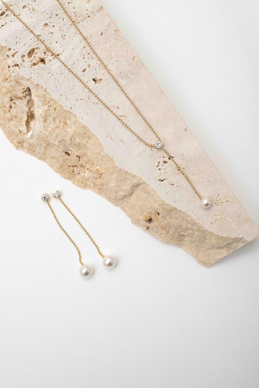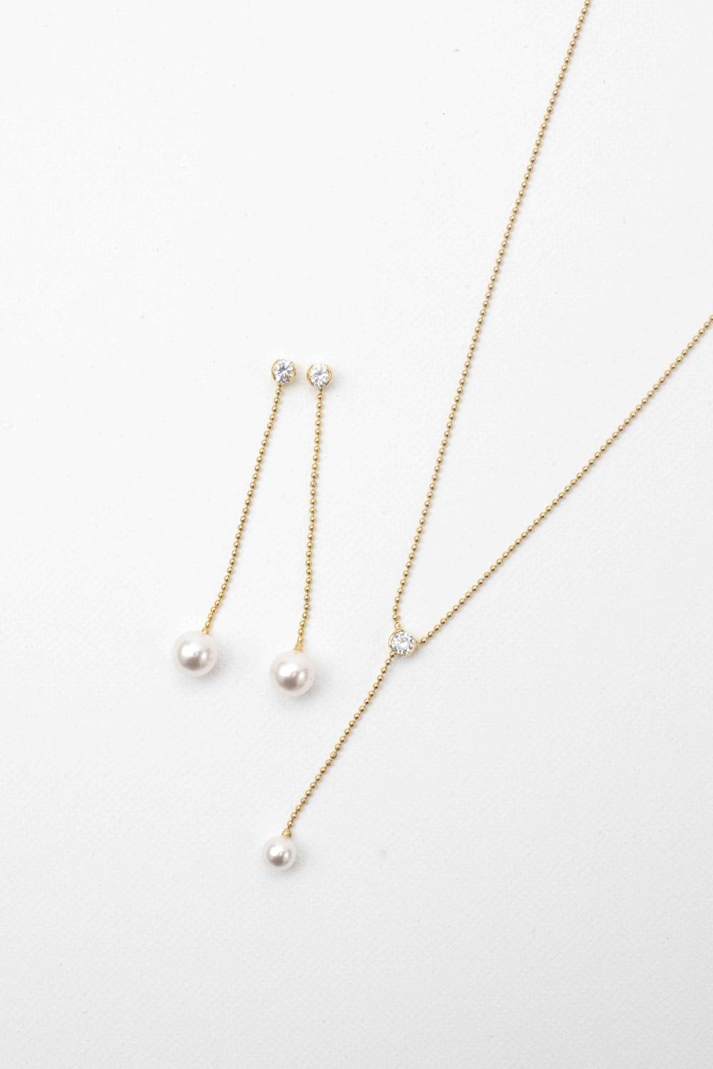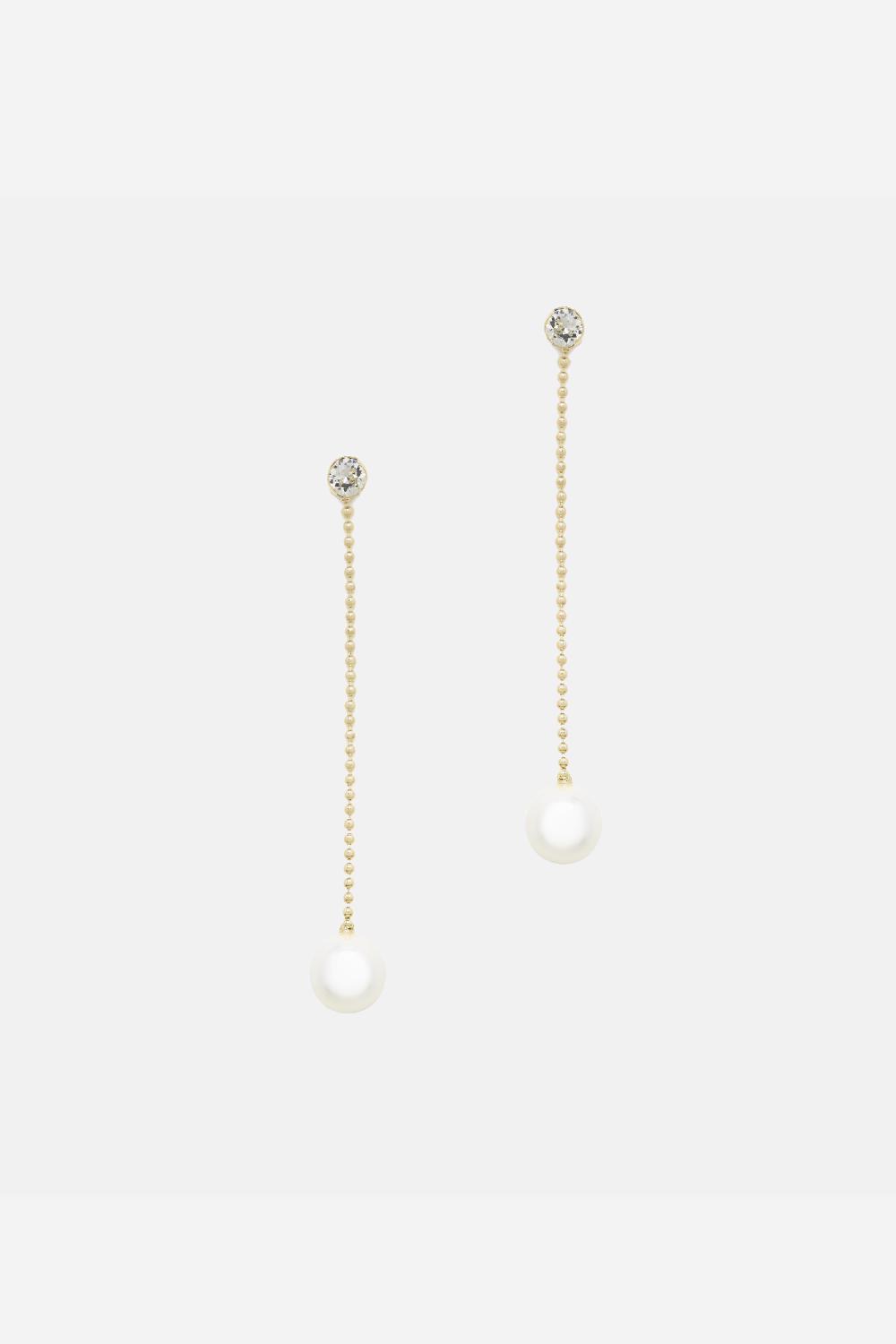 The Lovey Earrings are stylish and refined bridal earrings, crafted from a bead chain, featuring a Swarovski crystal at the top and a hanging Swarovski pearl below. The Lovey Earrings are available with rhodium, 14kt gold, or rose gold plating, and are a perfect match with the Lovey Necklace.