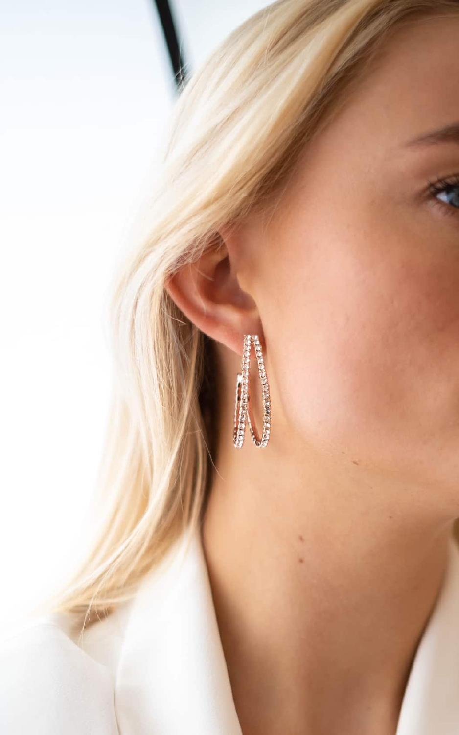 The Marilyn Earrings are amazing bridal statement earrings. These timeless pieces have two hoops attached to each other inlaid with small Swarovski crystals, and are available with a rhodium, 14kt gold or rose gold plating, in two different sizes.