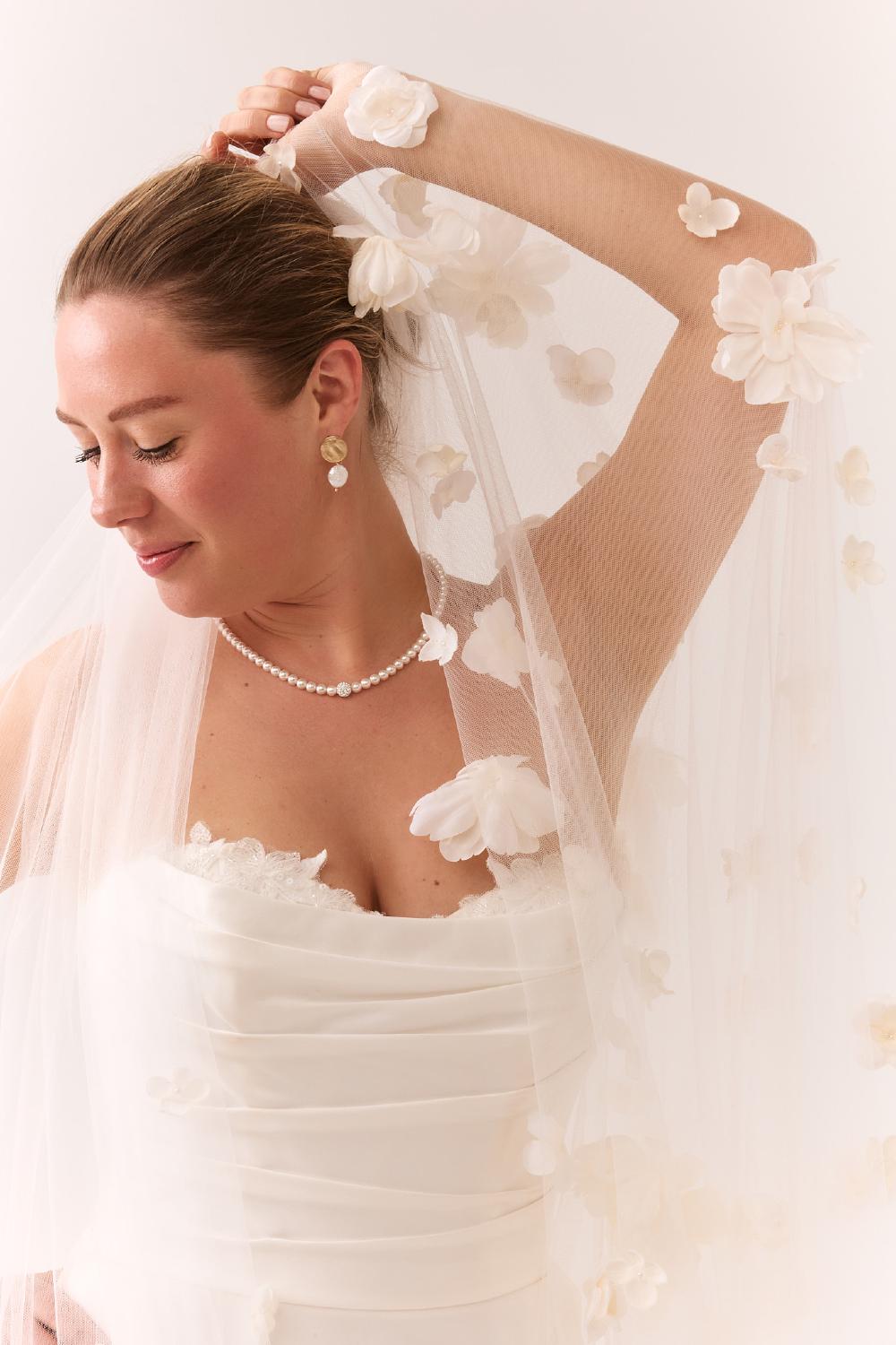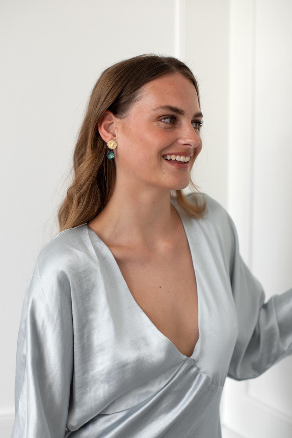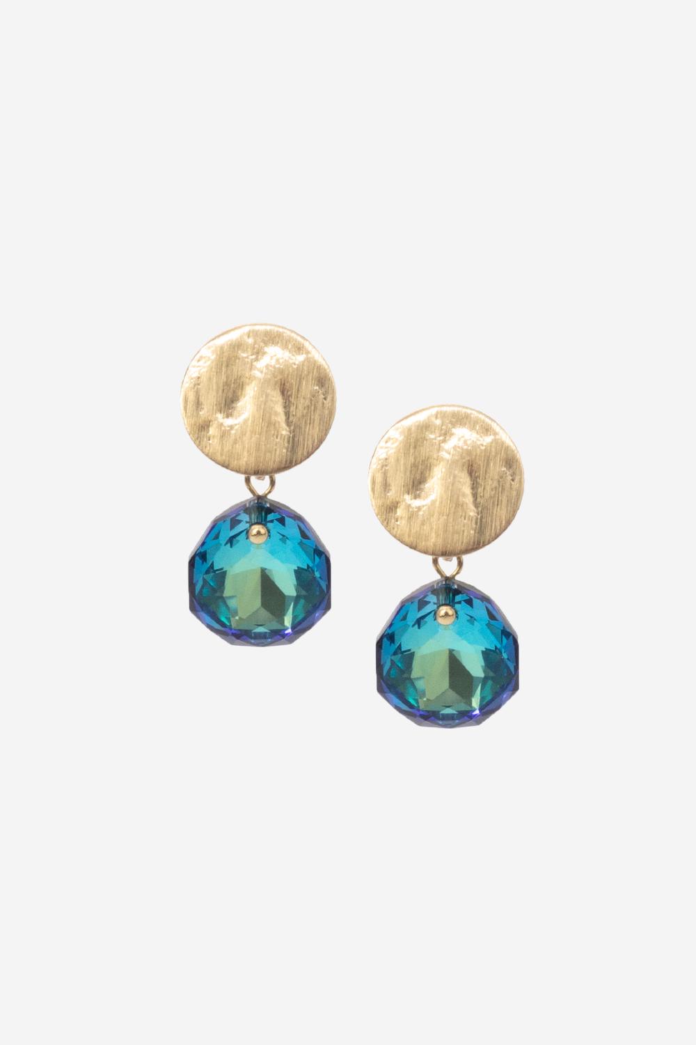 The Olga Earrings feature a round hammered stud with a pearl pendant. These earrings, perfect for the modern bride, are available with rhodium, 14kt gold or rose gold plating.