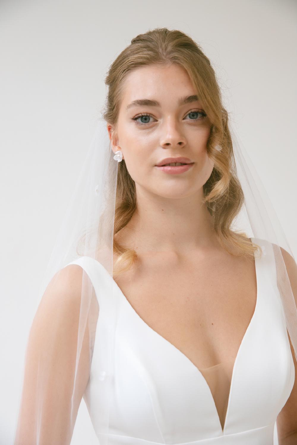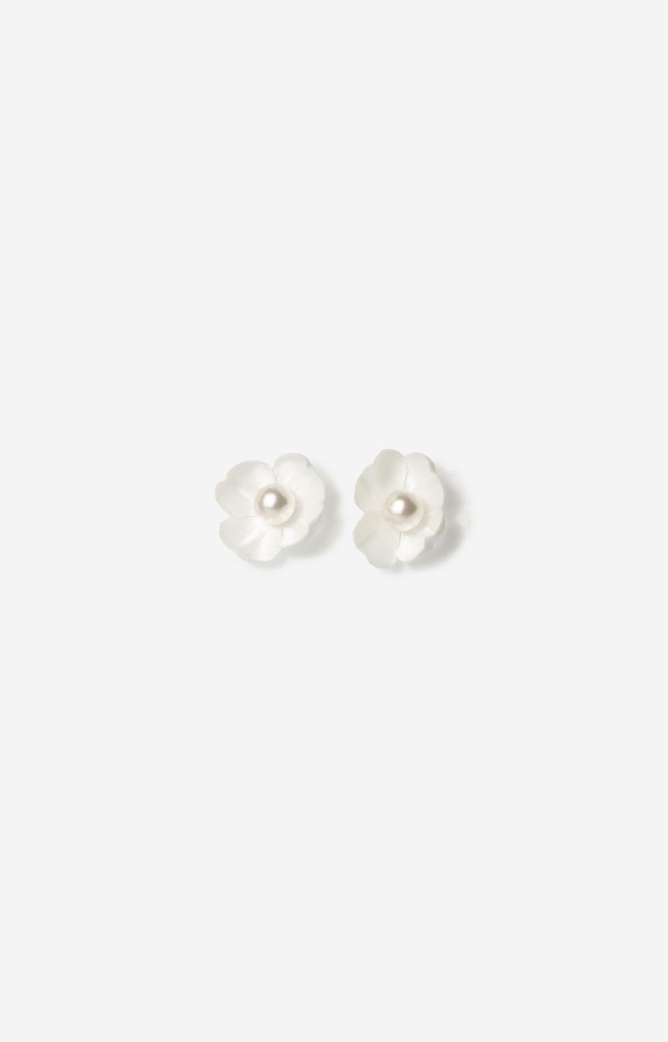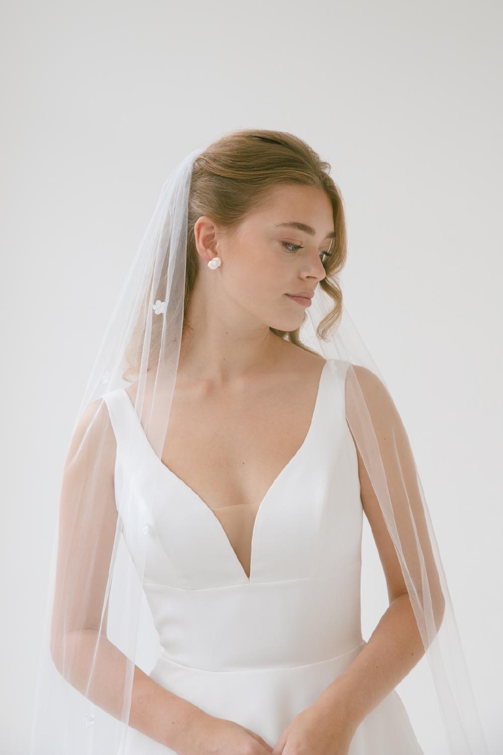 The Rosie Pearl Stud Earrings add a sweet, romantic touch to your bridal look. Each earring features a delicate fabric flower with a small pearl at its center, creating a soft, floral-inspired design. Perfect for brides seeking an elegant accessory with a hint of whimsy, these earrings are as charming as they are timeless.
