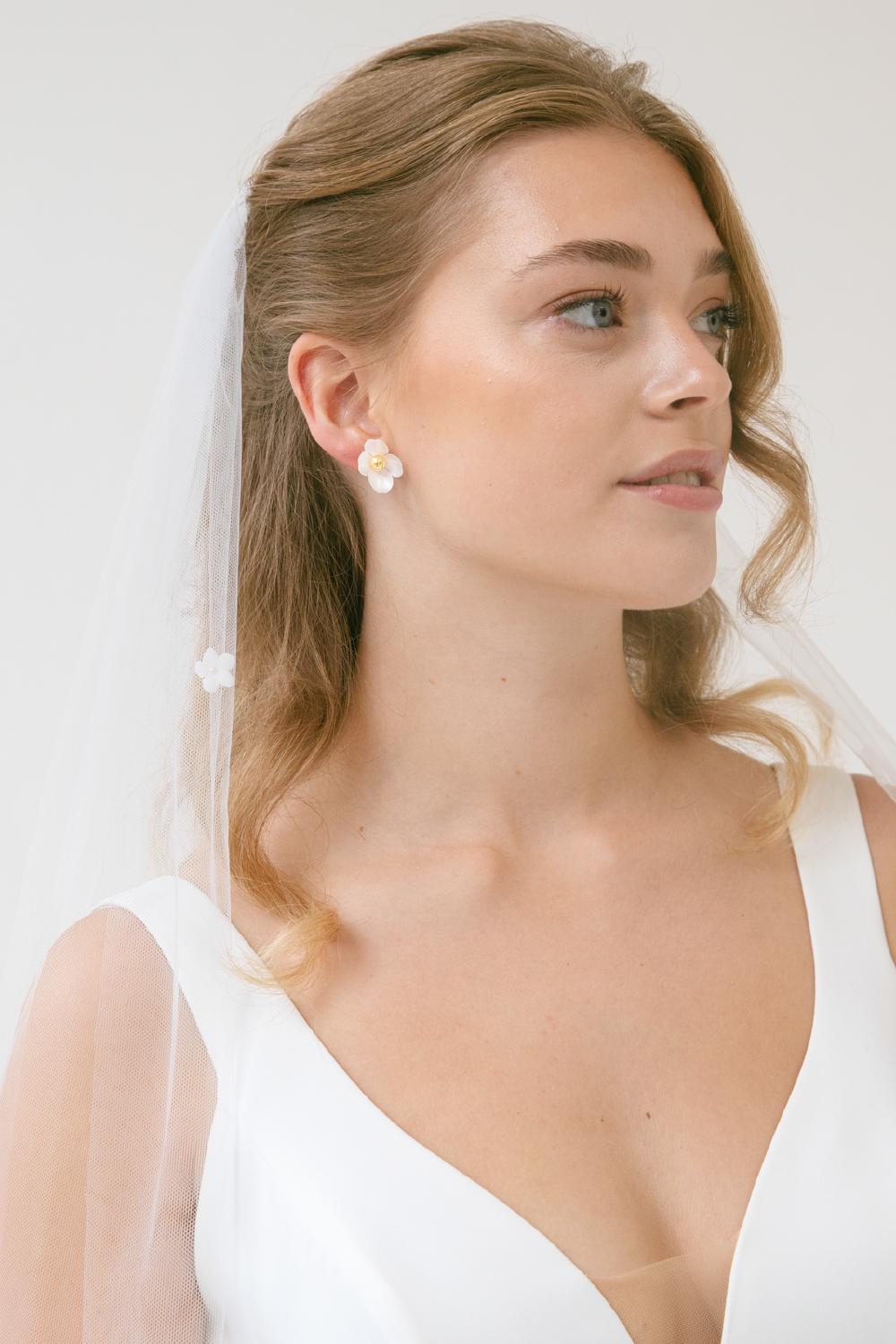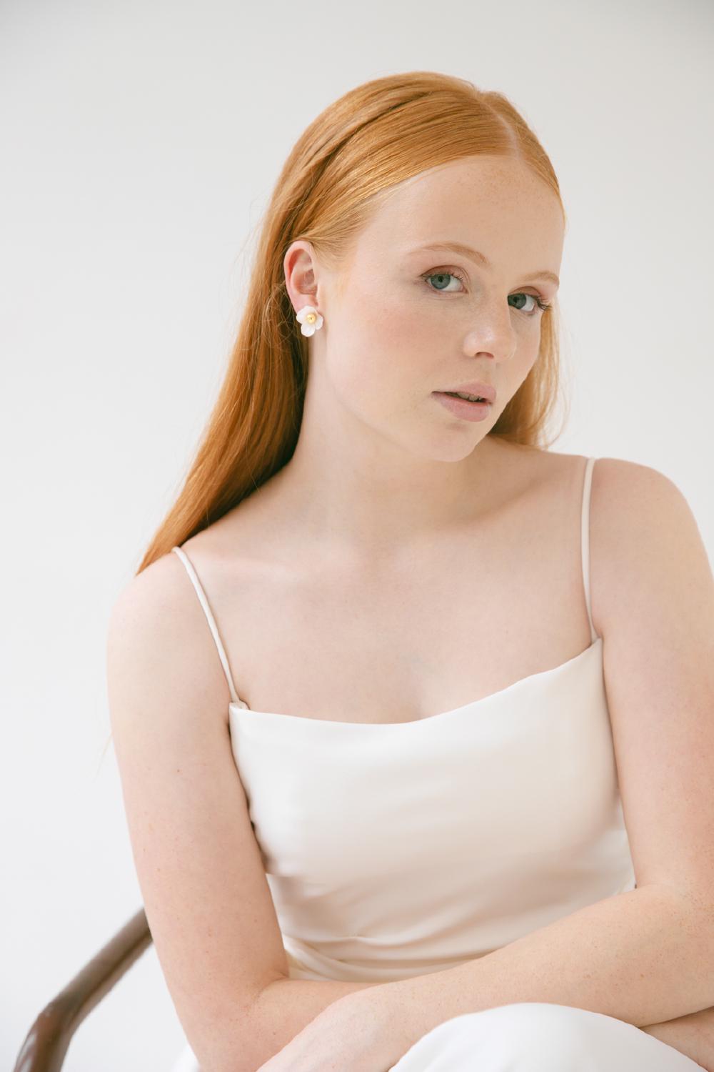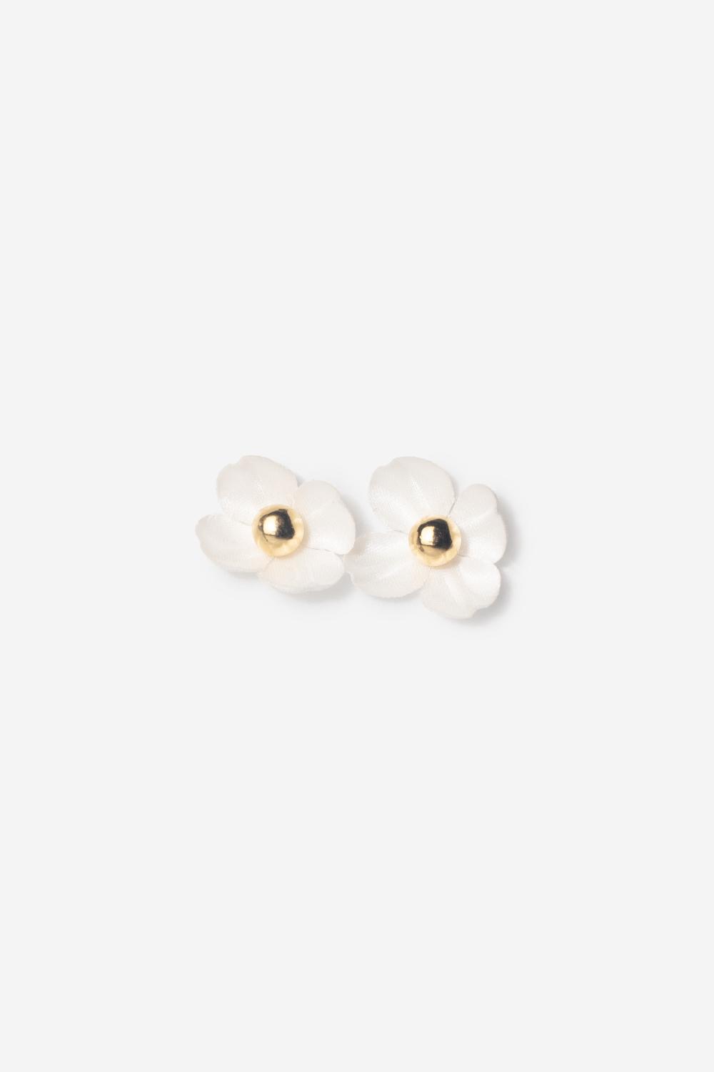 The Rosie Stud Earrings add a sweet, romantic touch to your bridal look. Each earring features a delicate fabric flower with a small gold ball at its center, creating a soft, floral-inspired design. Perfect for brides seeking an elegant accessory with a hint of whimsy, these earrings are as charming as they are timeless.