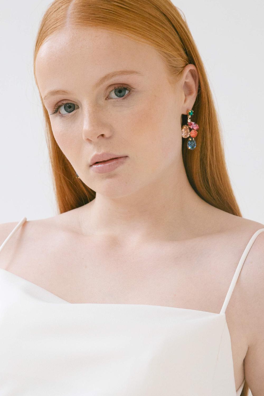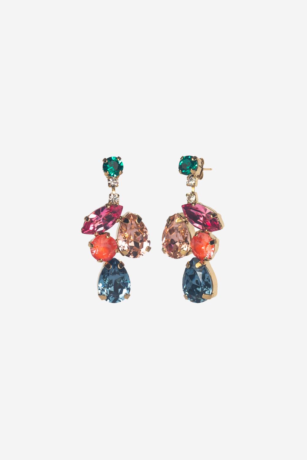 The Zola Earrings Multicolor, the colorful version of our Zola Earrings, is a statement piece that is sure to catch attention. These beautiful earrings are crafted with high-quality Swarovski crystals and durable brass, and are available exclusively in a stunning gold finish. The Zola Earrings Multicolor combine elegance with a playful, colorful look, perfect for a special occasion. They are a gorgeous choice for anyone looking for something unique, with a luxurious 14k gold plating.