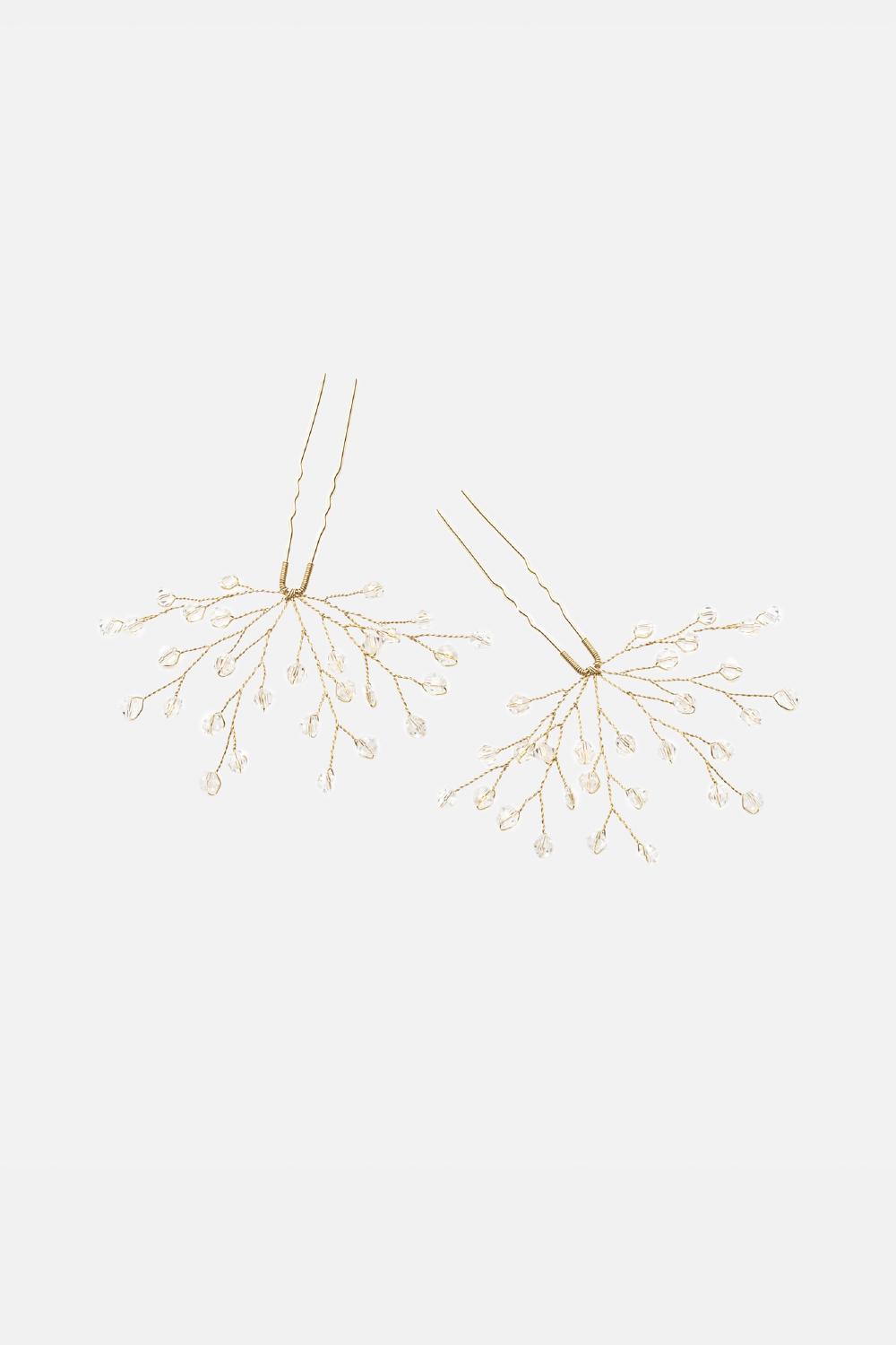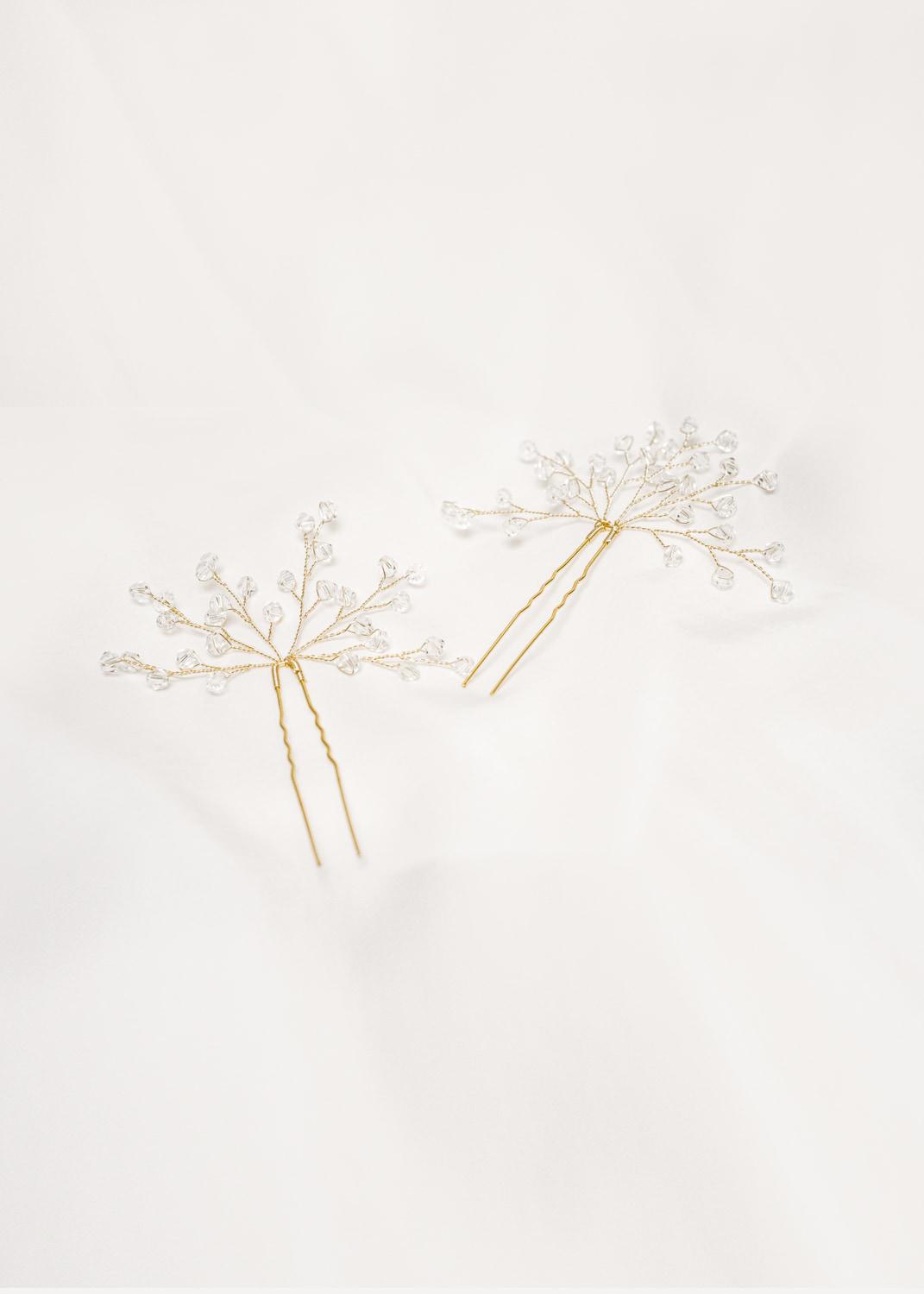 The Leah Hair Pins, sold in sets of two, are playful bridal hair accessories embellished with beautiful crystal beads. Due to the carefully hand twisted metal wires with a crystal on each end, these hair pins can be bent to their desired shape, making them a work of art for your hair on your wedding day. Available with both gold and rhodium plating.