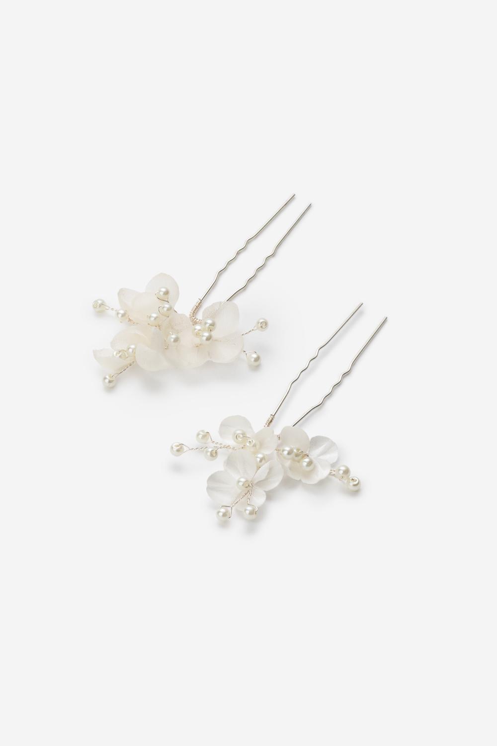 The Pippa Flower Hair Pins are sold in pairs and are adorned with beautiful pearls surrounded by off-white fabric leaves. Thanks to the carefully hand-twisted wires with each featuring a pearl at its end, can be gently bent to your liking. A stunning hair accessory for your bridal hairstyle, available with rhodium plating.