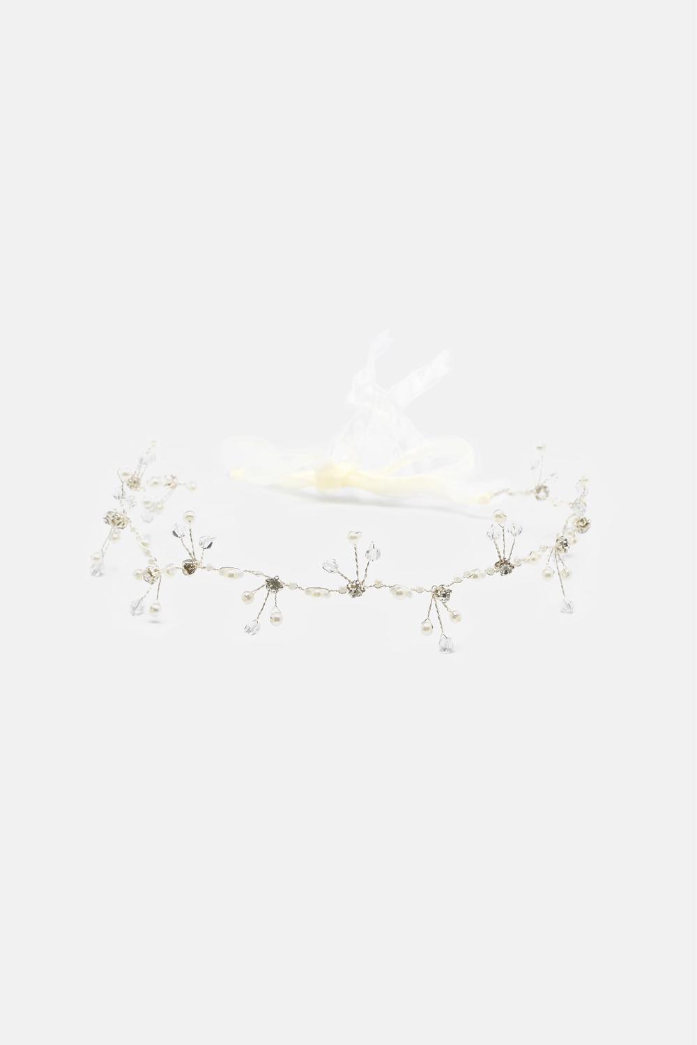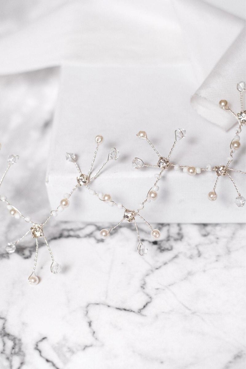 The Remi Headband is a bridal headband with subtle glass pearls and crystals. Due to its flexibility and length it can be worn with many different hairstyles, like buns, braids and up-dos.