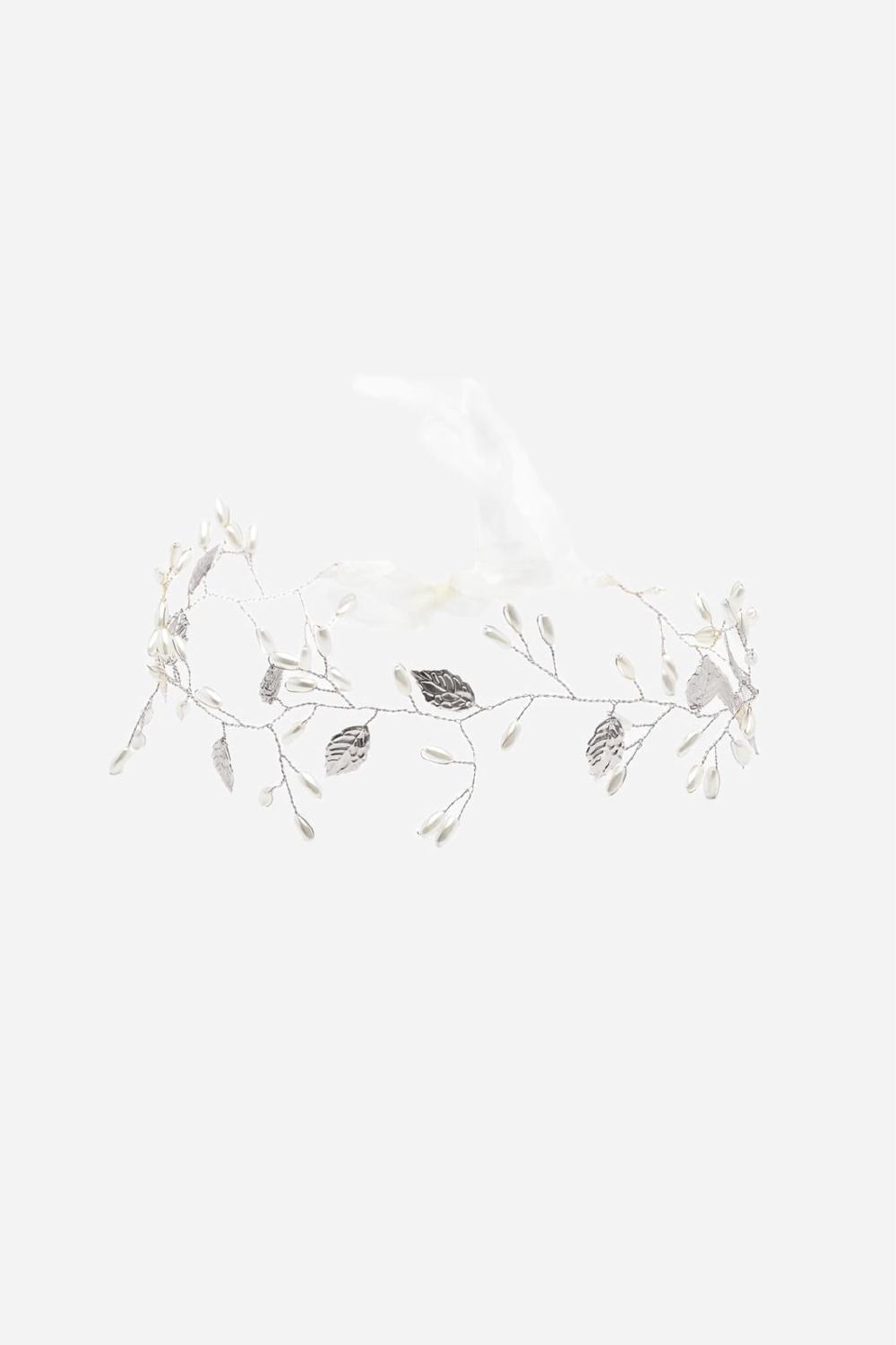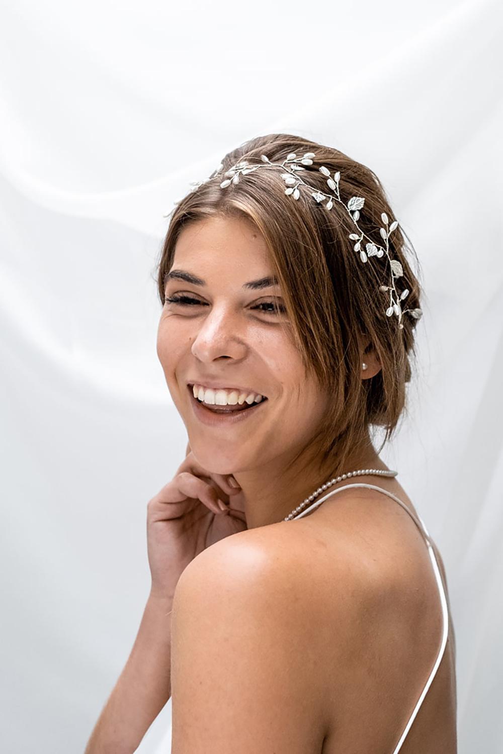 The Riley Headband is a bridal headband with subtle glass pearls and small rhodium plated leaves. Due to its flexibility and length it can be worn with many different hairstyles, like buns, braids and up-dos. Available in rhodium, rose and gold finishes.