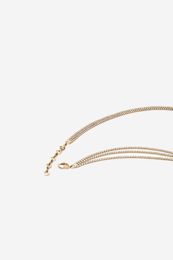 The Carry Necklace is made with three incredibly beautiful and dainty crystal chains, the thinnest crystal chains we've ever used to create a necklace. The Carry Necklace is available with rhodium or 14kt gold plating. If you're looking for a bridal jewelry set, make sure to check out the Carry Bracelet or Bieke Earrings too.