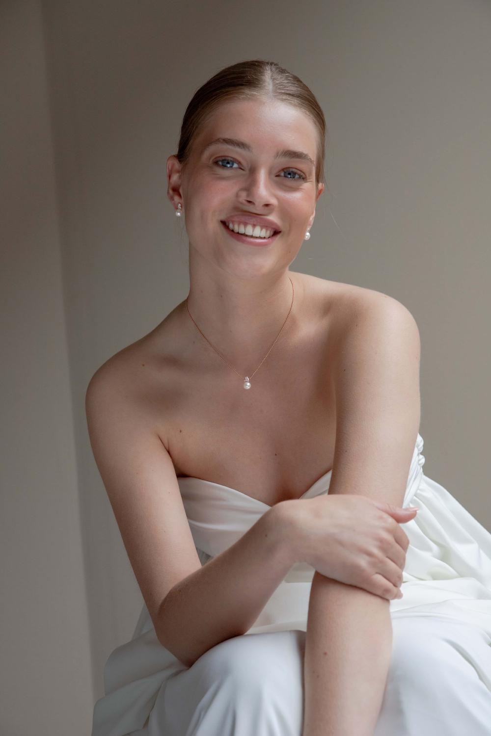 The Julia Necklace is a subtle yet chique necklace with a classic allure. This bridal necklace has three dainty crystals with a single Swarovski pearl below. Due to its classic look, the Julia Necklace is easy to pair with the Julia Pearl Earrings, or with other necklaces to create your own look on your wedding day. The Julia Necklace is available with rhodium, 14kt gold or rose gold plating.