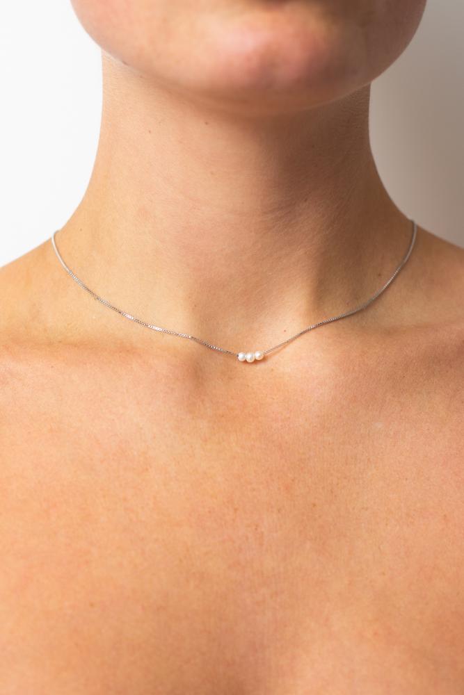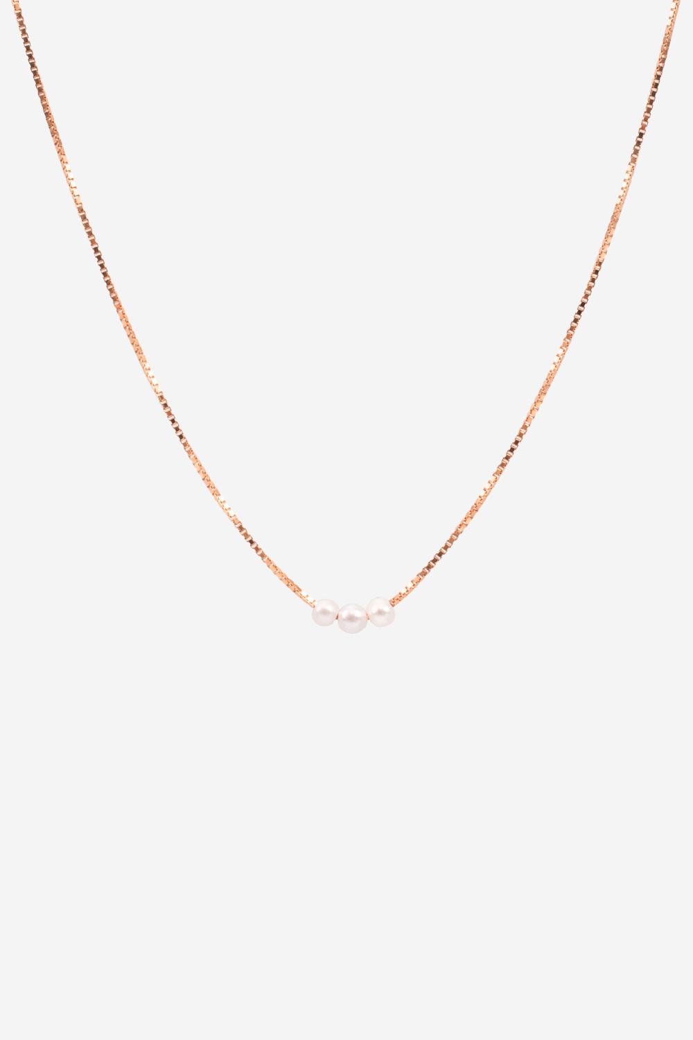 This fine boxchain has three little 3mm pearls in the center of the necklace. This necklace is crafted from sterling silver and fastened with a secure spring clasp. A subtle and classic necklace that is beautiful to wear and easy to match. Available with rhodium plating, 14kt gold, or rose gold.