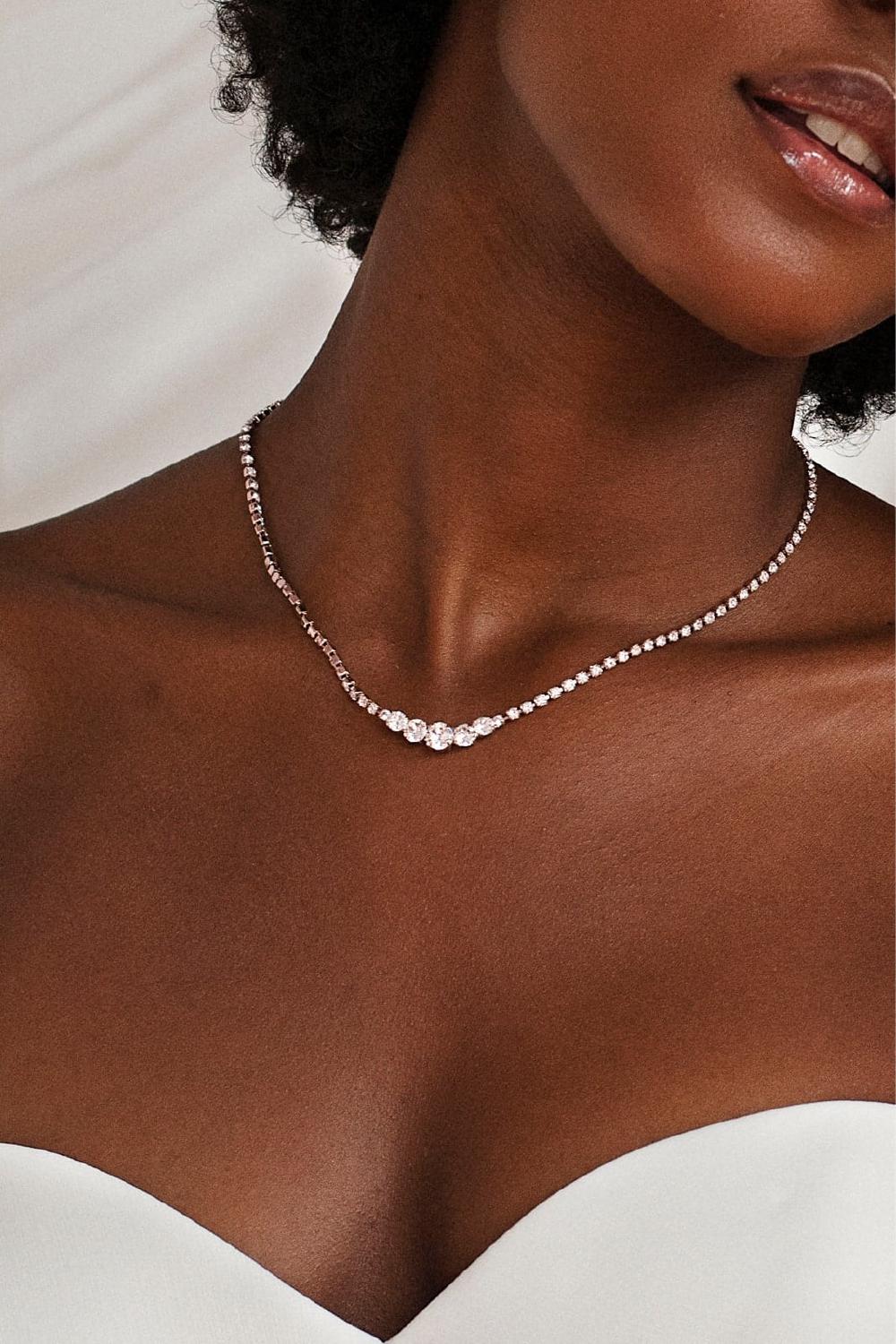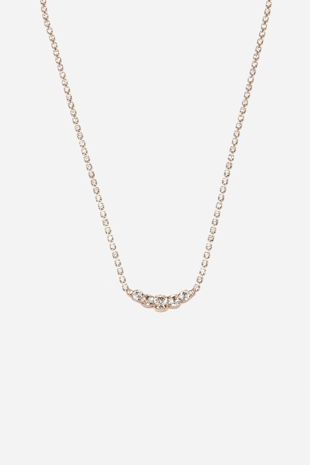 The Royal Necklace is a refined but amazing piece of jewelry. It features a single row of beautiful, high quality crystals, with bigger crystals in the center. An amazing necklace for the classic bride. The Royal Necklace is made out of durabel brass and available with rhodium, 14kt gold or rose gold plating. If you're looking for a bridal jewelry set, make sure to check out the Royal Bracelet too.