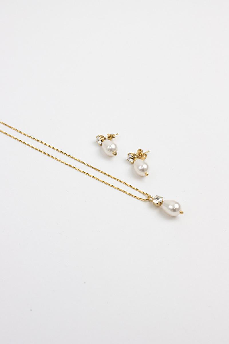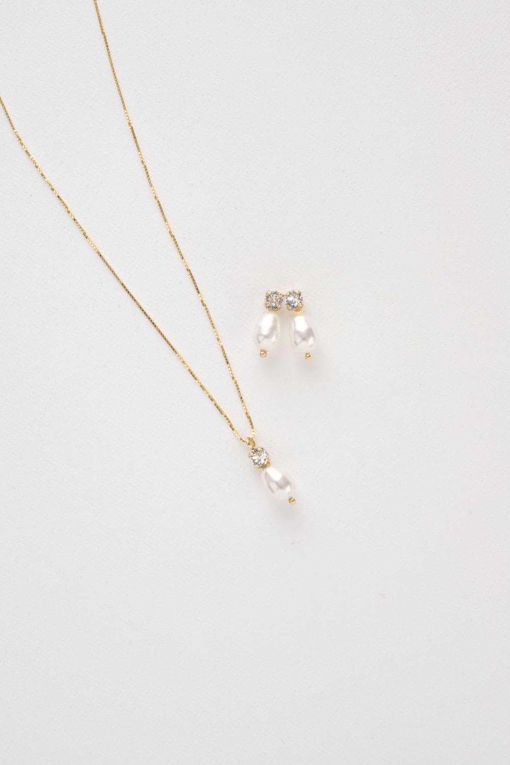 The Elena Necklace set is a subtle yet chique bridal jewelry set. The Elena Necklace is made with a 925 silver box chain and a hand soldered crystal and pearl pendant, and easy to combine with the handmade Elena Earrings. The Elena Necklace set is available with rhodium, 14kt gold or rose gold plating.