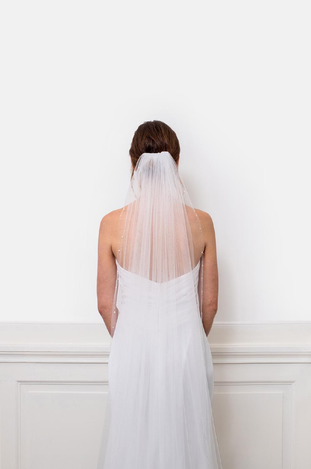 Discover River; a beautiful veil with pearls, made of ivory Italian tulle. The small, subtle pearls are very carefully attached to both sides of the tulle, so that the pearls are always beautifully in view.