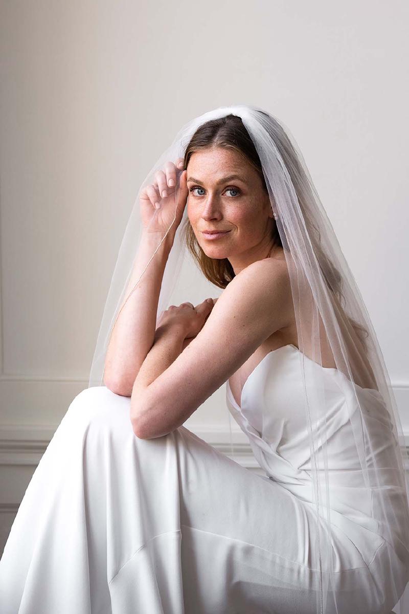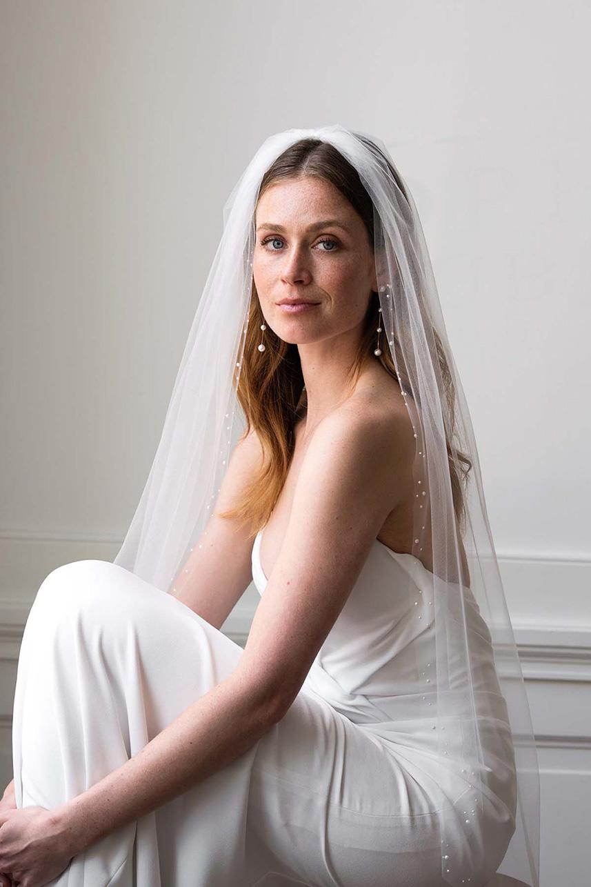 The pearls are placed at the edge of the tulle, starting from the comb to the end of the veil. The beautiful pearls of the River veil add a romantic touch to your bridal look, perfect for the modern bride.