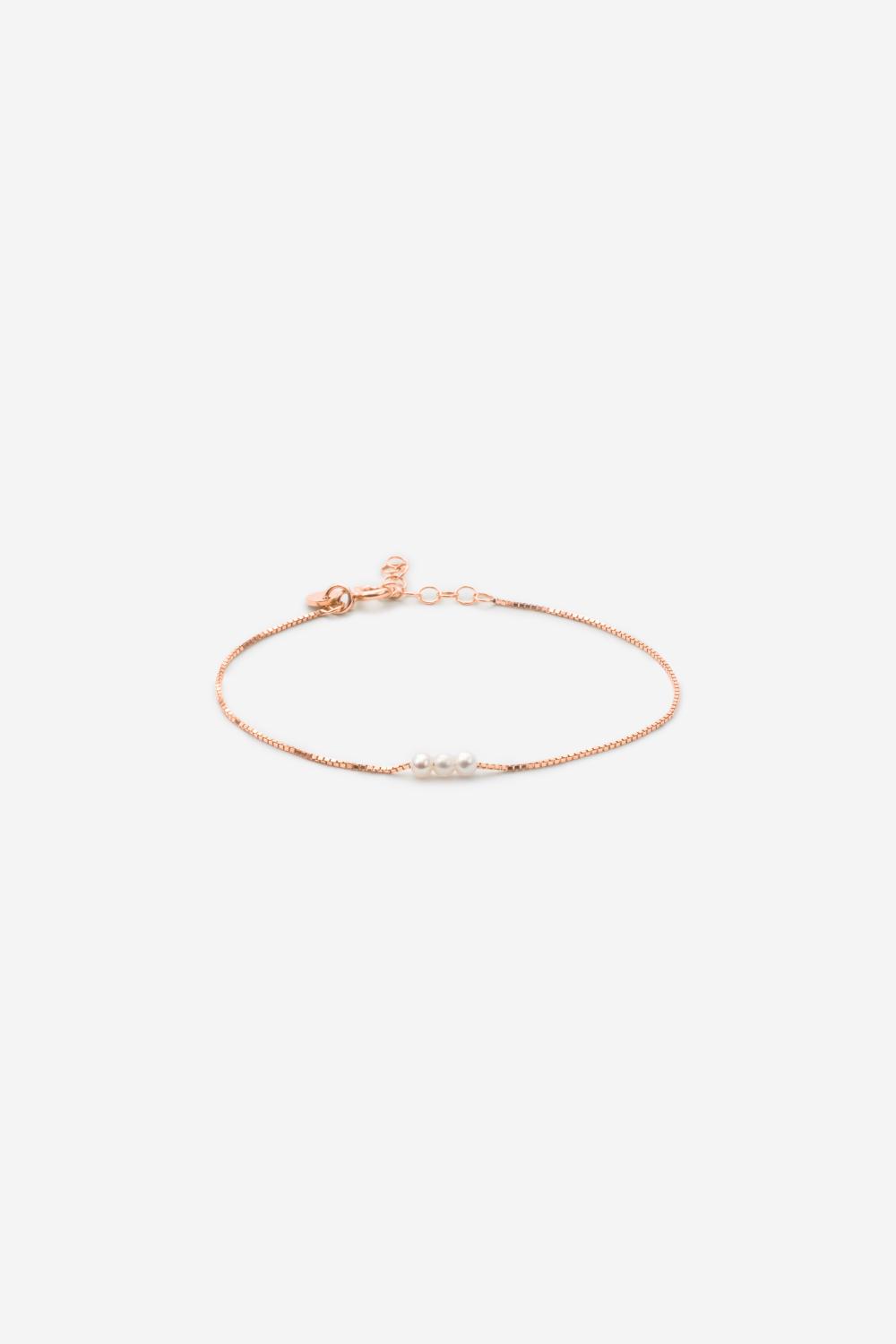 Deze verfijnde schakelarmband heeft drie kleine parels van 3mm in het midden van de armband. Deze armband is gesmeed uit sterling zilver en wordt gesloten met een gezekerde veersluiting. Een subtiele en klassieke armband, die fijn is om te dragen en gemakkelijk te combineren. Verkrijgbaar met een plating van rhodium, 14 kt goud, of rosé-goud.