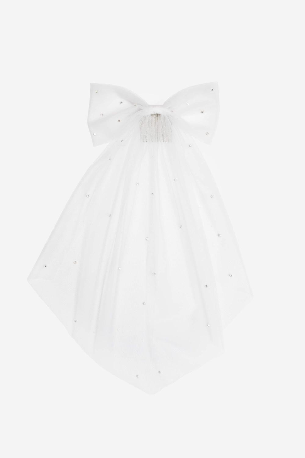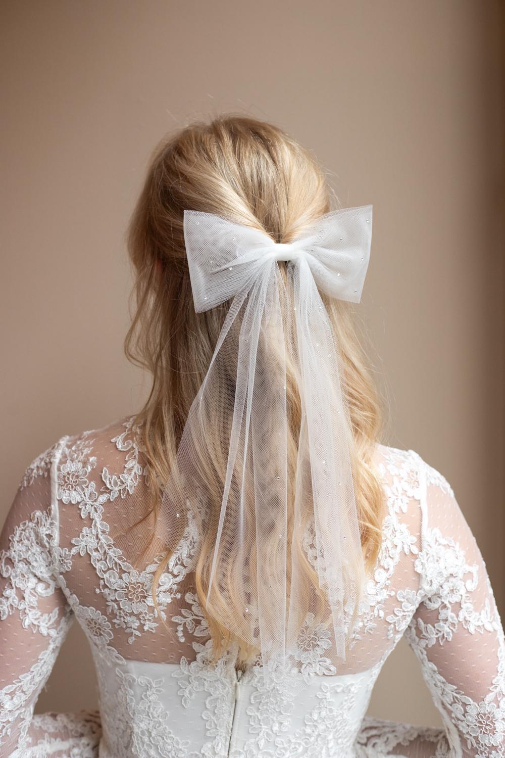 De Bella Haarstrik is handgemaakt van ivoorkleurig Italiaanse tule, met zorgvuldig geplaatste kristal details die van de kam tot aan het einde van de strik lopen. Deze sprankelende kristallen voegen een romantische touch toe aan je bruidslook en laten je stralen op je speciale dag. Dankzij de haarkam die aan de haarstrik is bevestigd, is het eenvoudig om je bruidssluier te verwisselen met een van onze strikken, zonder je kapsel opnieuw te hoeven doen. De perfecte keuze voor bruiden die een vleugje vrouwelijkheid aan hun trouwlook willen toevoegen.