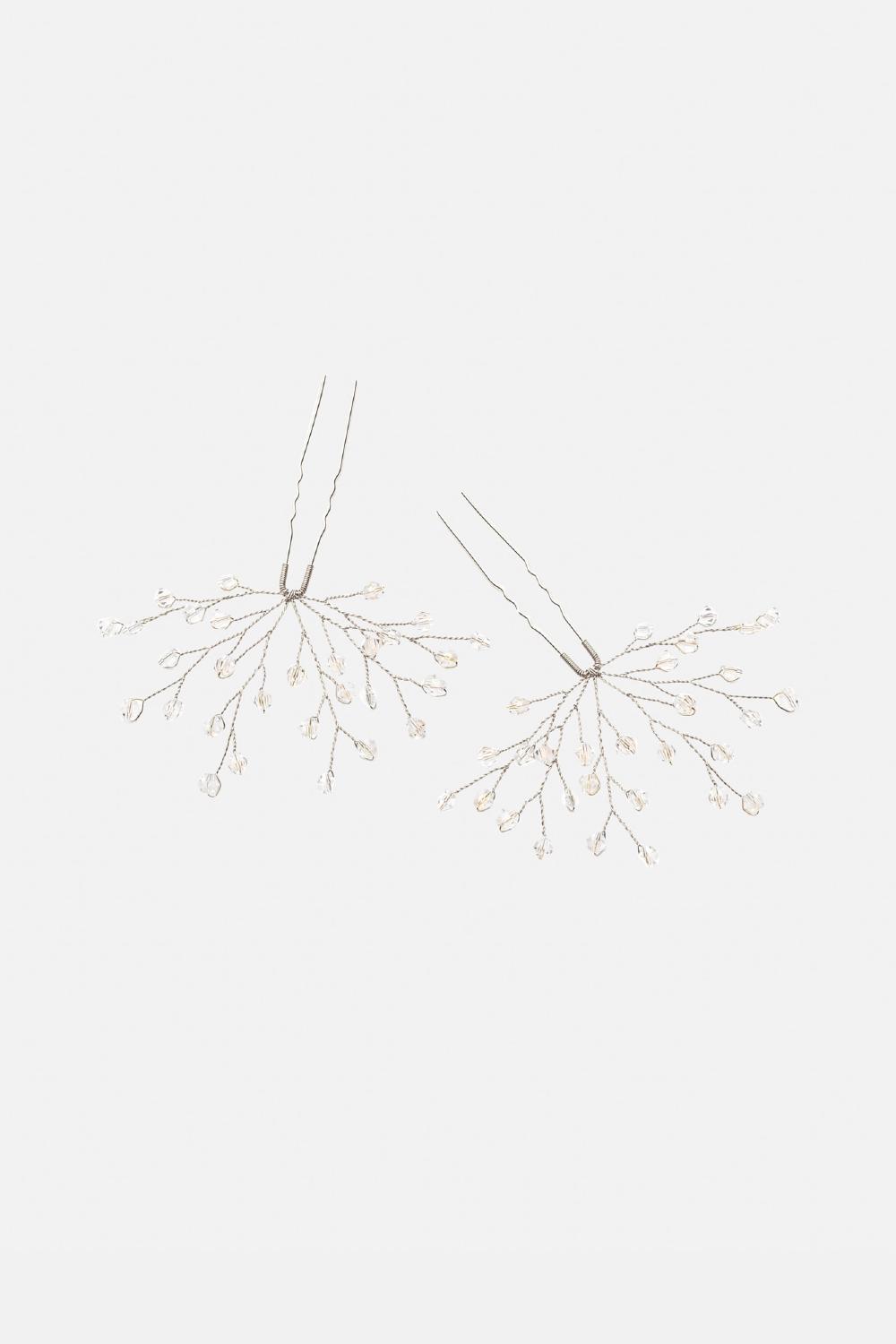 De Leah Haarpinnen worden per twee verkocht en zijn versierd met prachtige kristallen kraaltjes. Door de zorgvuldig met de hand gedraaide draden, met aan ieder einde een kristalletje, kunnen de haarspelden voorzichtig naar wens gebogen worden. Een prachtig haaraccessoire voor in je bruidskapsel, verkrijgbaar met zowel gouden als rhodium plating.