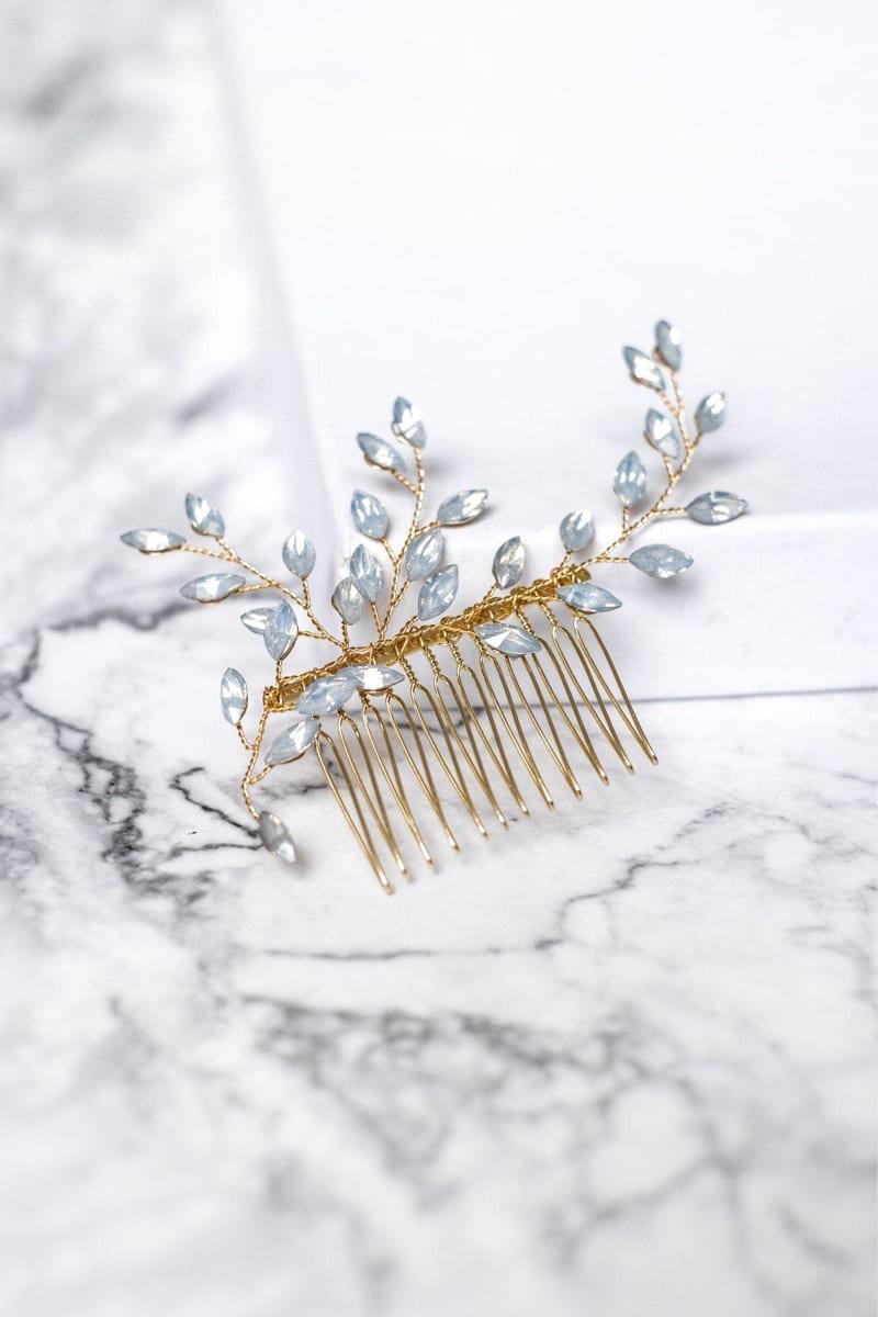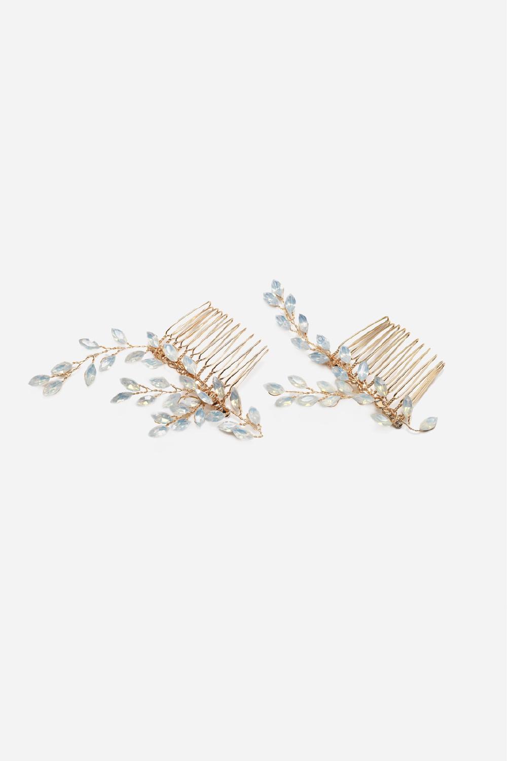 De Luna Haarkam Set is een opvallend stuk uit onze bruidscollectie, gemaakt van buigzaam goudkleurig metaal en afgewerkt met opaalkleurige kristallen. De twee stukken kunnen in losse krullen worden gedraaid of in een knot worden gezet om de look voor je grote dag af te maken.
