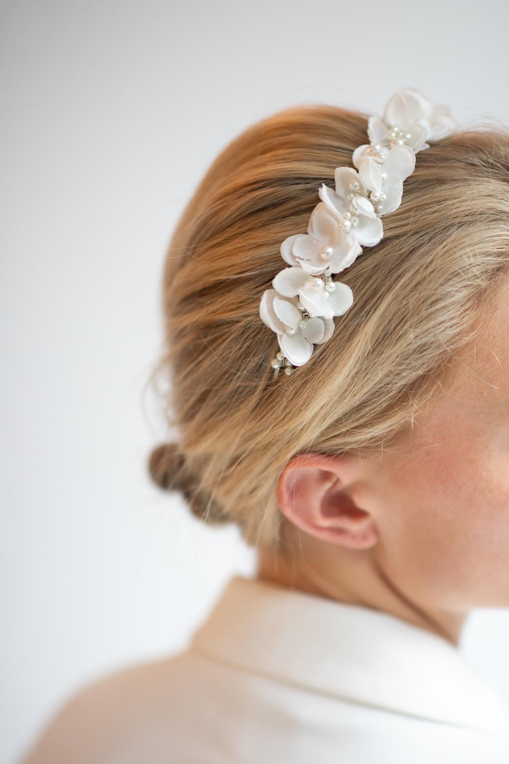 De Paige Tiara is een modern haaraccessoire voor de bruid, gemaakt met prachtige glasparels en stoffen bloemblaadjes in gebroken wit, wat het effect van een 3D-bloem creëert. Dankzij de verschillende parelgroottes en de met de hand gedraaide metalen draden, is deze imperfect-perfecte tiara een echte eyecatcher voor je bruidskapsel. Beschikbaar met rhodium plating.
