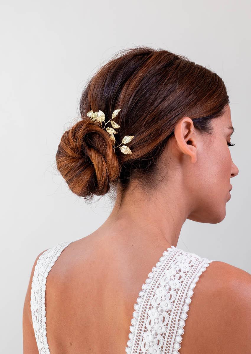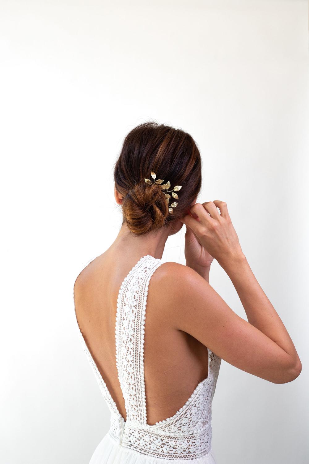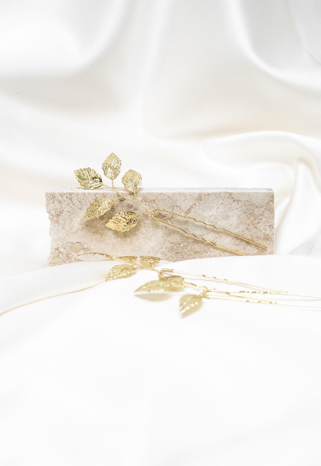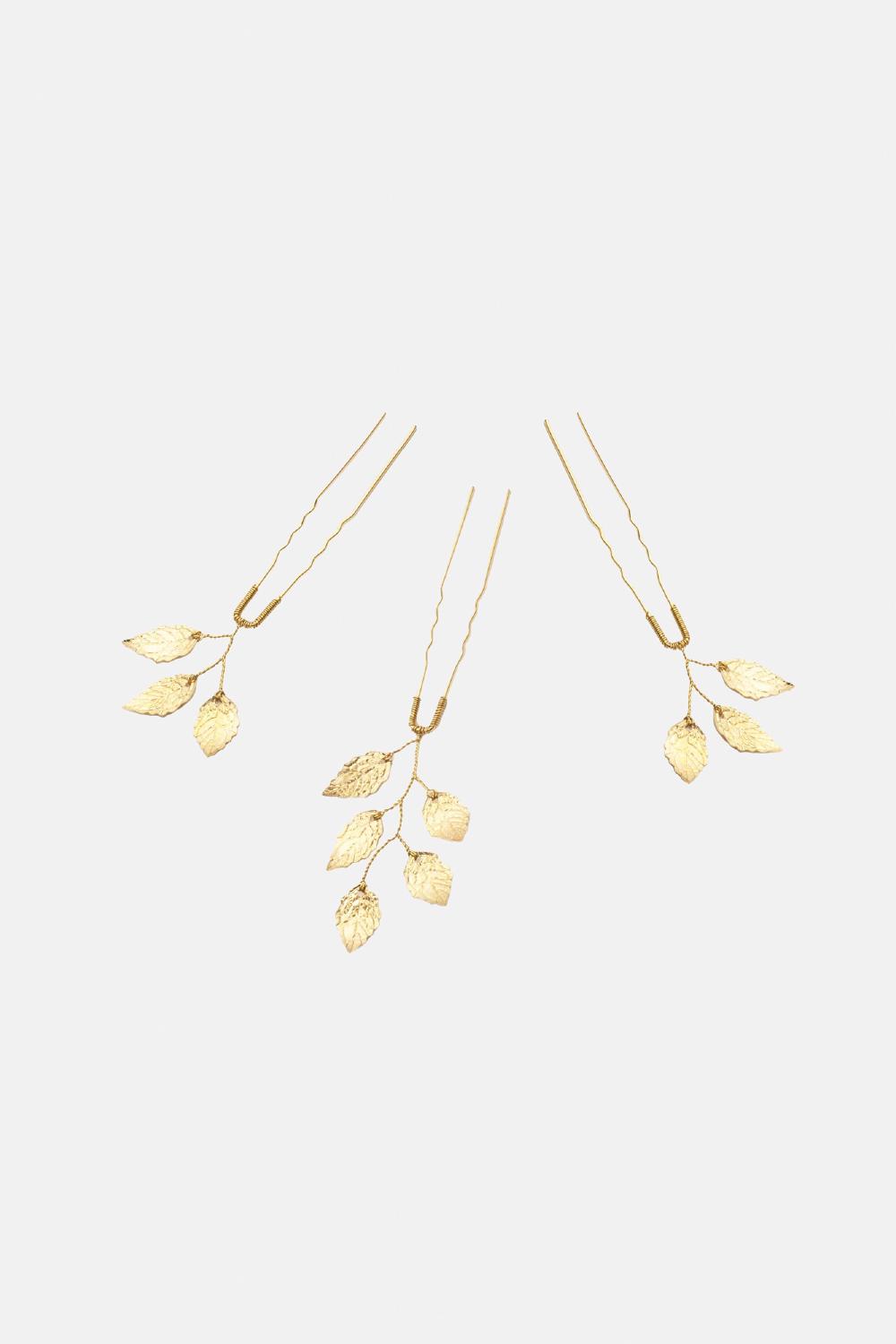 De Petal Haarpinnen worden per drie verkocht en zijn versierd met prachtige metalen blaadjes. Door de zorgvuldig met de hand gedraaide draden, met aan ieder einde een bloemblaadje, kunnen ze voorzichtig naar wens gebogen worden. Een prachtig haaraccessoire voor in je bruidskapsel, verkrijgbaar met zowel gouden als rhodium plating.