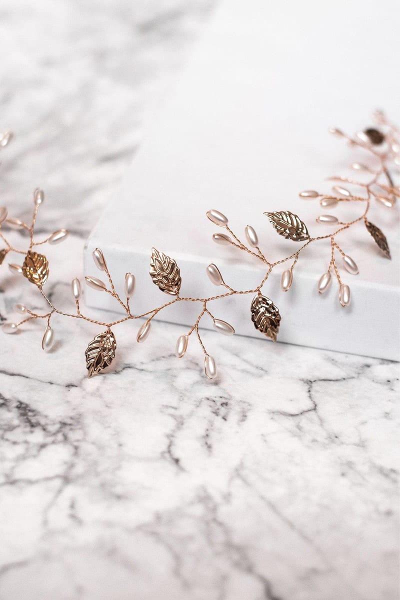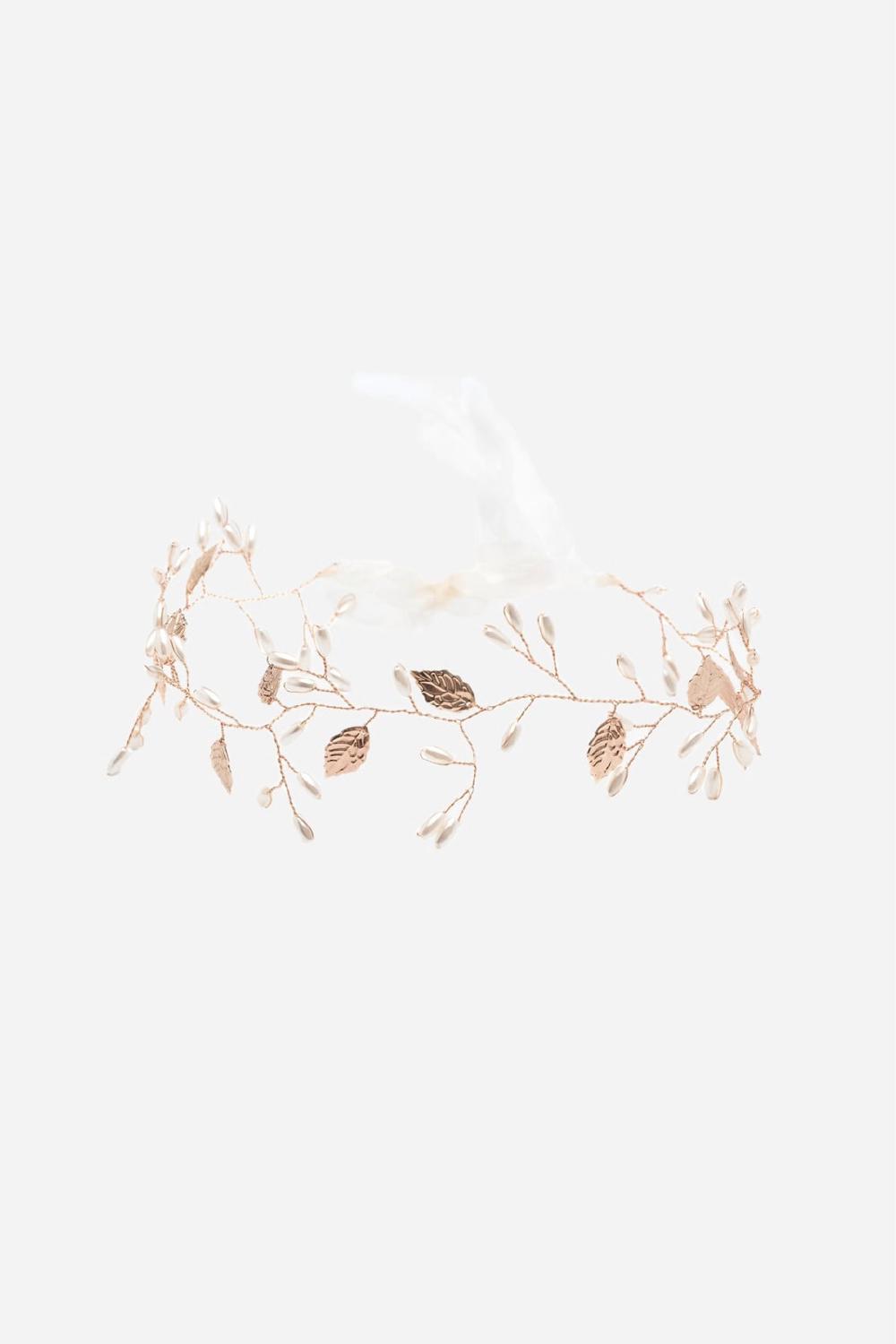 De Riley haarband is een bruidshaarband met subtiele glasparels en kleine gerhodineerde blaadjes. Door zijn flexibiliteit en lengte kan hij gedragen worden met veel verschillende kapsels, zoals knotten, vlechten en opgestoken haar. Verkrijgbaar in rhodium, rosé en goud afwerking.
