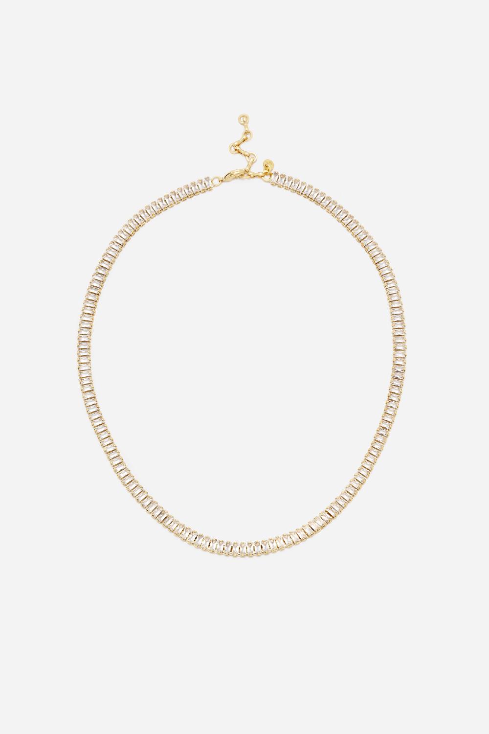 De Baguette Ketting, een Abrazi bruidsfavoriet, is een prachtige ketting om op zichzelf te dragen of te combineren met de Baguette armband en/of oorbellen. De ketting bestaat uit een enkele rij baguette geslepen kristallen en is verkrijgbaar met plating in goud of rhodium.