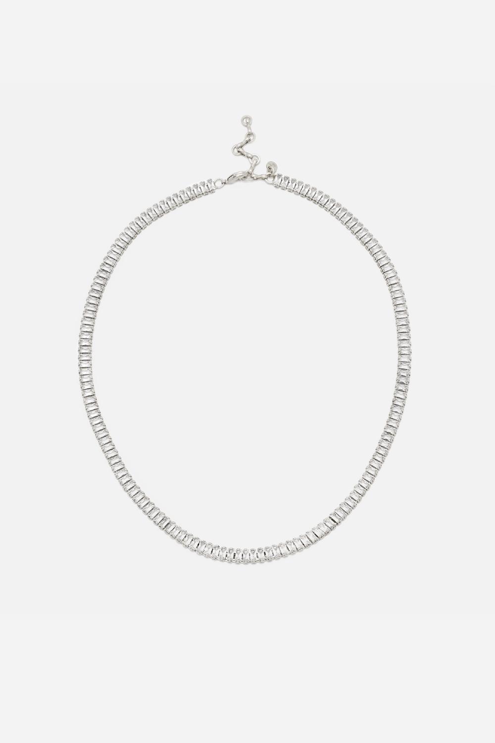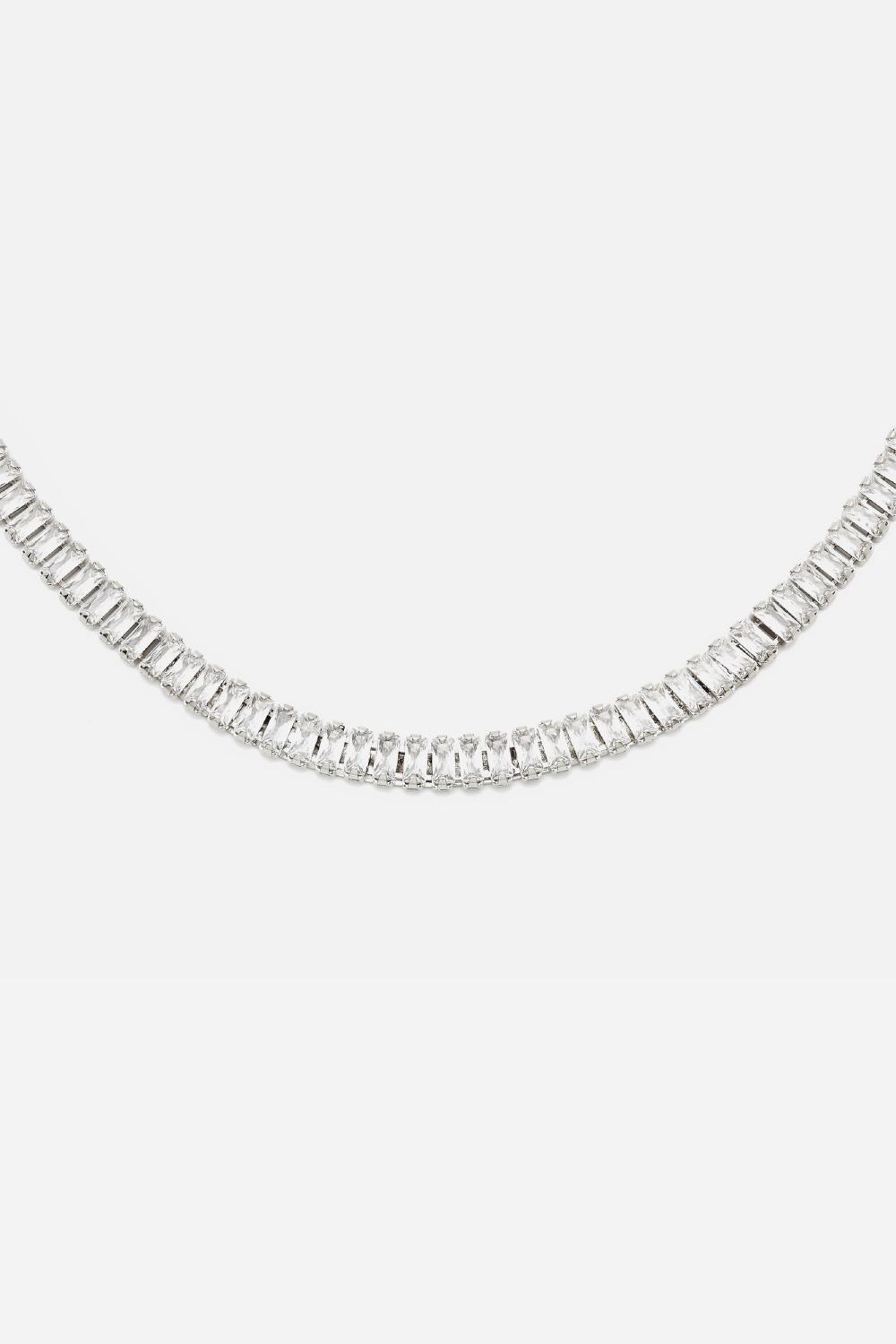 De Baguette Ketting, een Abrazi bruidsfavoriet, is een prachtige ketting om op zichzelf te dragen of te combineren met de Baguette armband en/of oorbellen. De ketting bestaat uit een enkele rij baguette geslepen kristallen en is verkrijgbaar met plating in goud of rhodium.