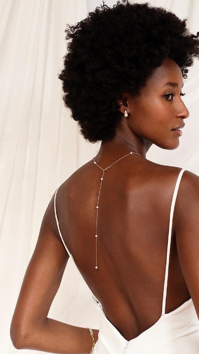 De Jessie Ketting is een subtiel maar chique sieraad dat op vele manieren te dragen is, zoals bijvoorbeeld als rugketting. De Jessie Ketting is gemaakt van een 925 zilveren bead chain en zoetwaterparels, en verkrijgbaar met rhodium, 14kt goud of roségoud plating. Een veelzijdig sieraad voor de moderne bruid.